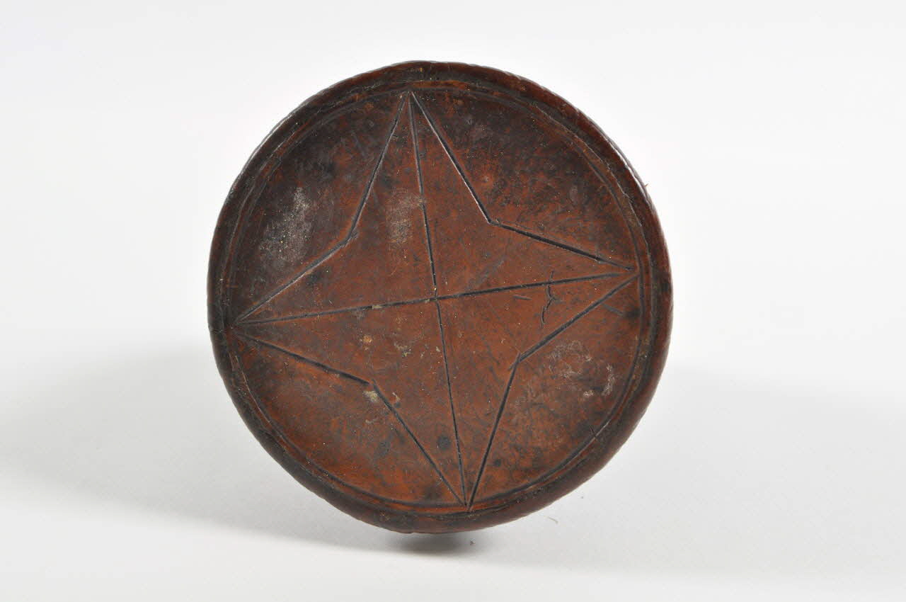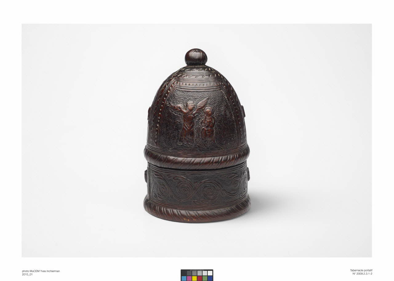 La technique employée pour réaliser cet objet est le noyer tourné gainé de cuir gaufré et incisé. La technique de l'application du cuir gaufré sur du bois est une technique connue et largement utilisée au XVIe siècle en Lombardie et en Toscane pour des objets d'apparat sacrés et profanes (des rotelles de la même époque sont conservées dans les collections de l'armurerie de Milan). Nos collections conservent un seul tabernacle (beaucoup plus tardif) réalisé pour l'Eglise de Saint-Augustin à Paris, mais aucun objet de cette époque et de cette facture.Décor