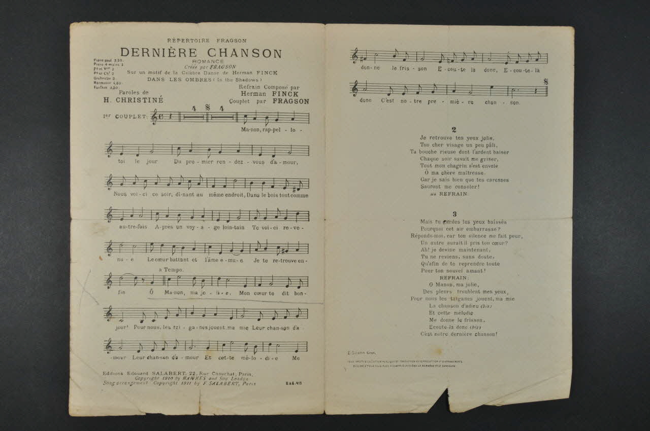 Autour, encadrement d'une frise florale. Des inscriptions renseignent le titre, les auteurs, les exécutants et l'éditeur. A l'intérieur, partition et paroles de la chanson. Au dos, publicité pour le succès de la chanson "Dans les ombres".Matériaux et techniques