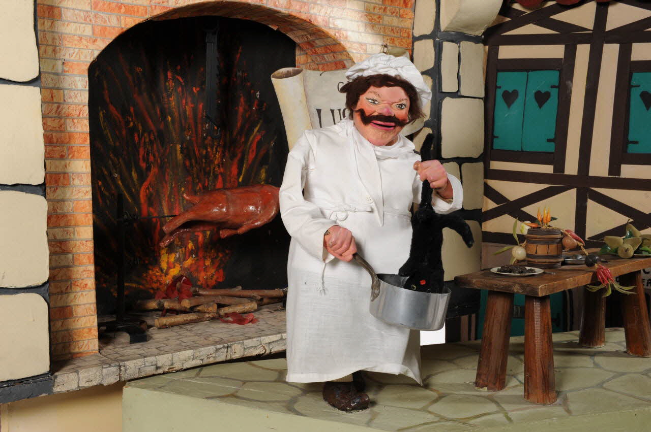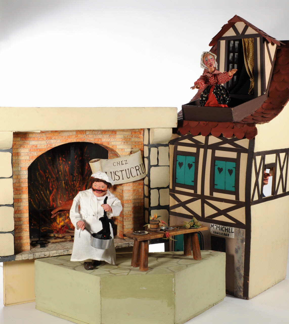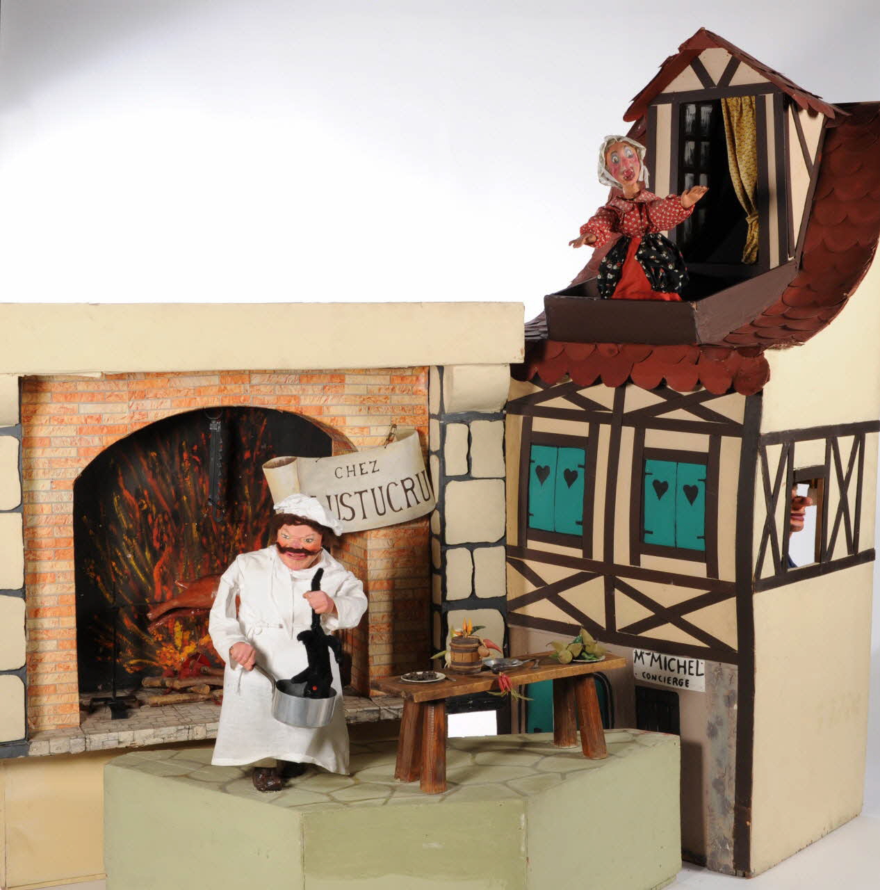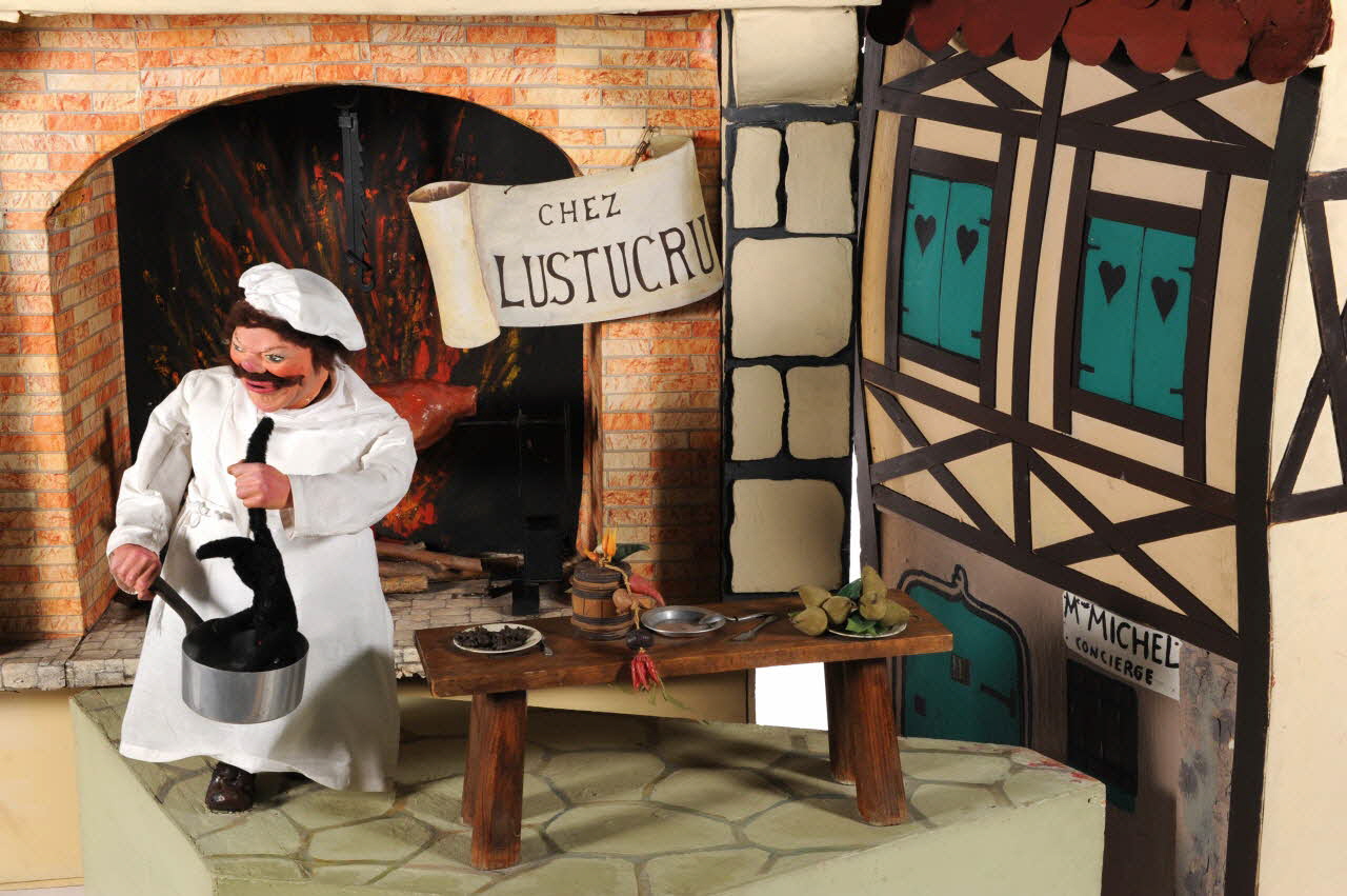 Au premier plan, un personnage masculin moustachu, Père Lustucru, est devant la cheminée à côté d'un tourneborche animé dans la cheminée avec un effet de flamme. Au second plan, au niveau supérieur, la Mère Michel lèvre les bras au ciel. A l'intérieur de la maison gesticule un personnage à la fenêtre.Décor
