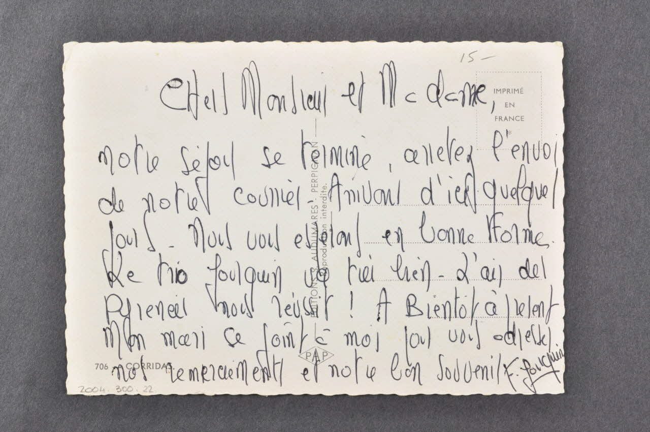 Chers Monsieur et Madame, / notre séjour se termin, arretez l'envoi / de notre cousrrier. Arrivons d'ici quelque / jours. Nous vous esperons en bonne Forme / Le trio Jourquin va très bien. L'air des / Pyrenées nous réussit ! A bientôt à présent / Mon mari se joint à moi pour vous adresser / nos remerciement et notre bon souvenir / F. Jourquin, versoDécor