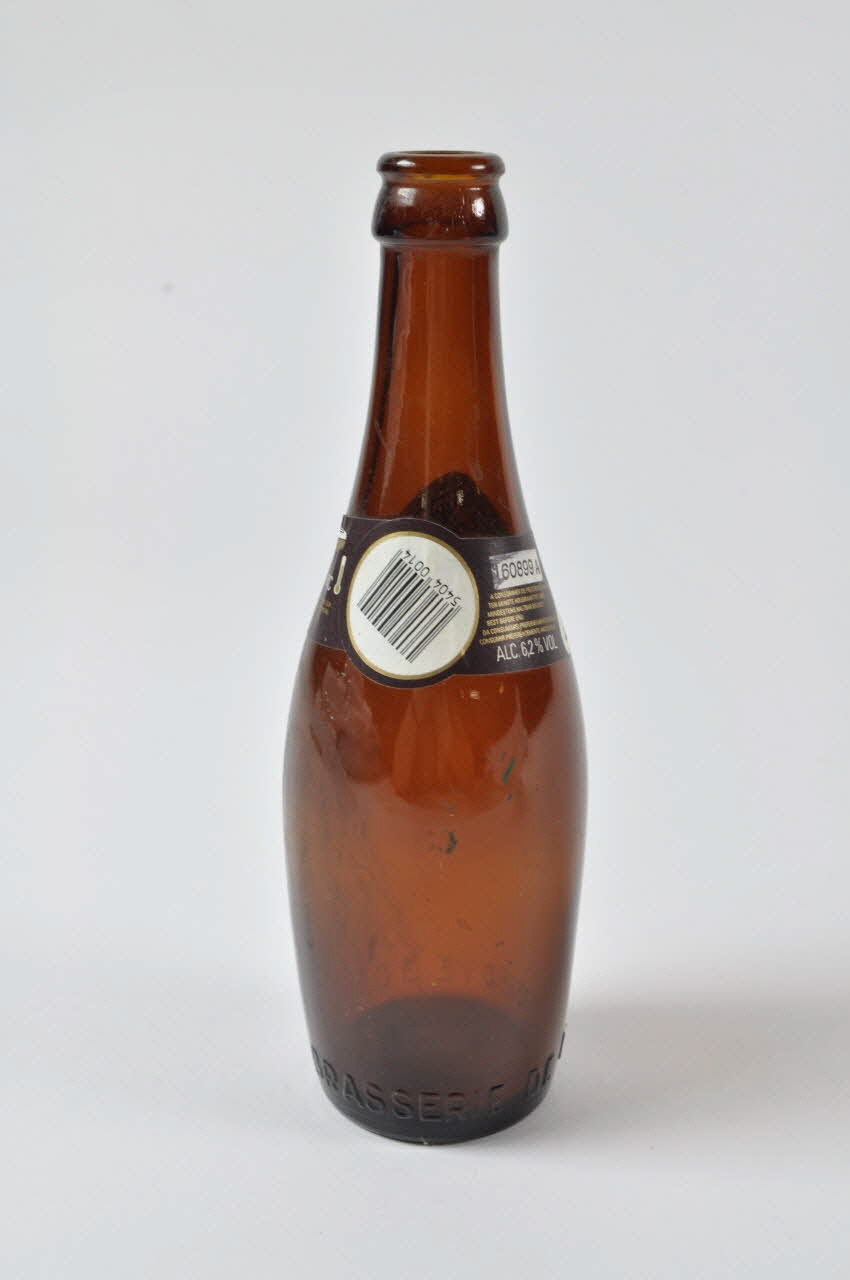 Bouteille de bière en verre coloré marron. La panse est bombée et cylindrique.