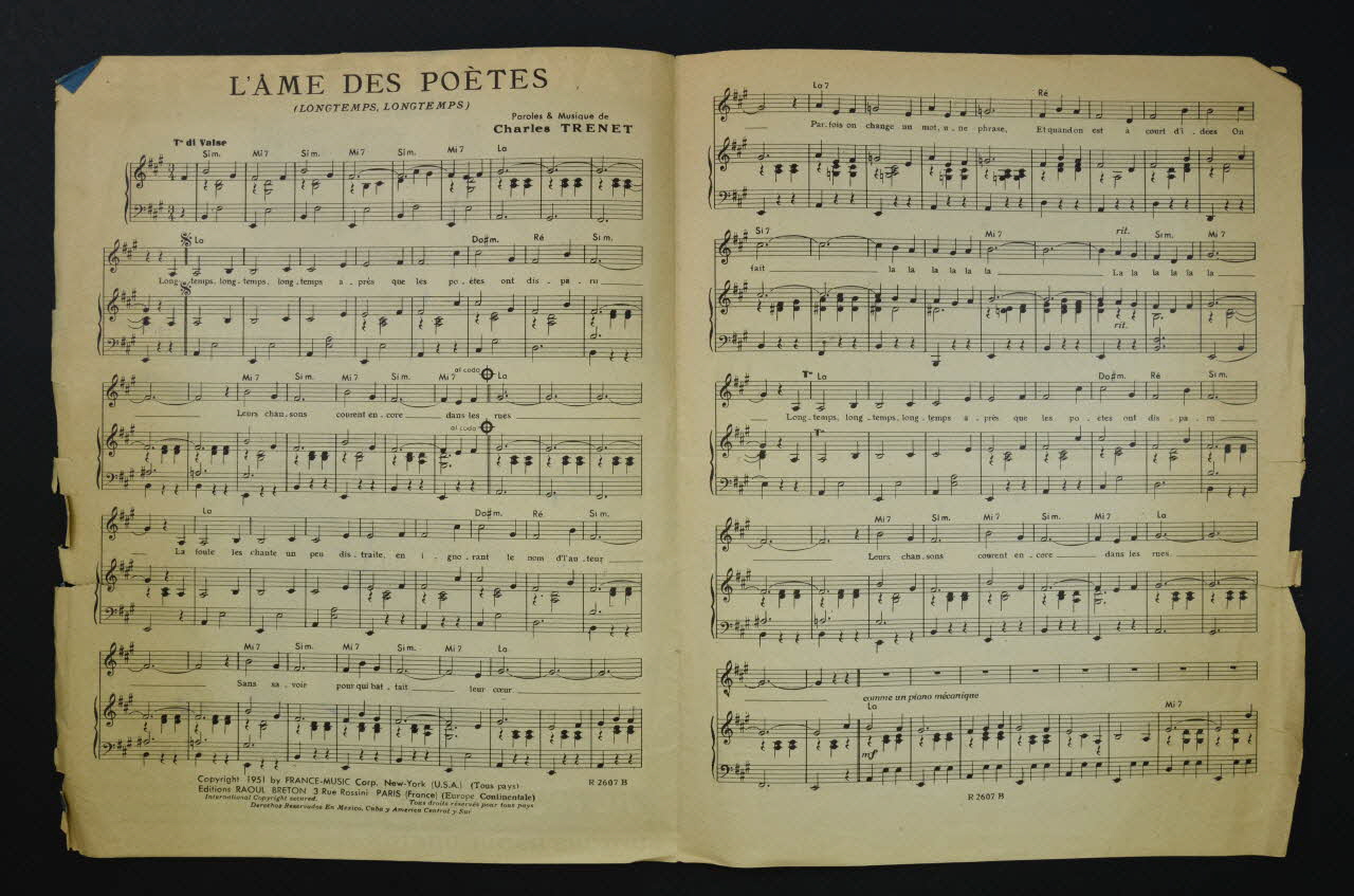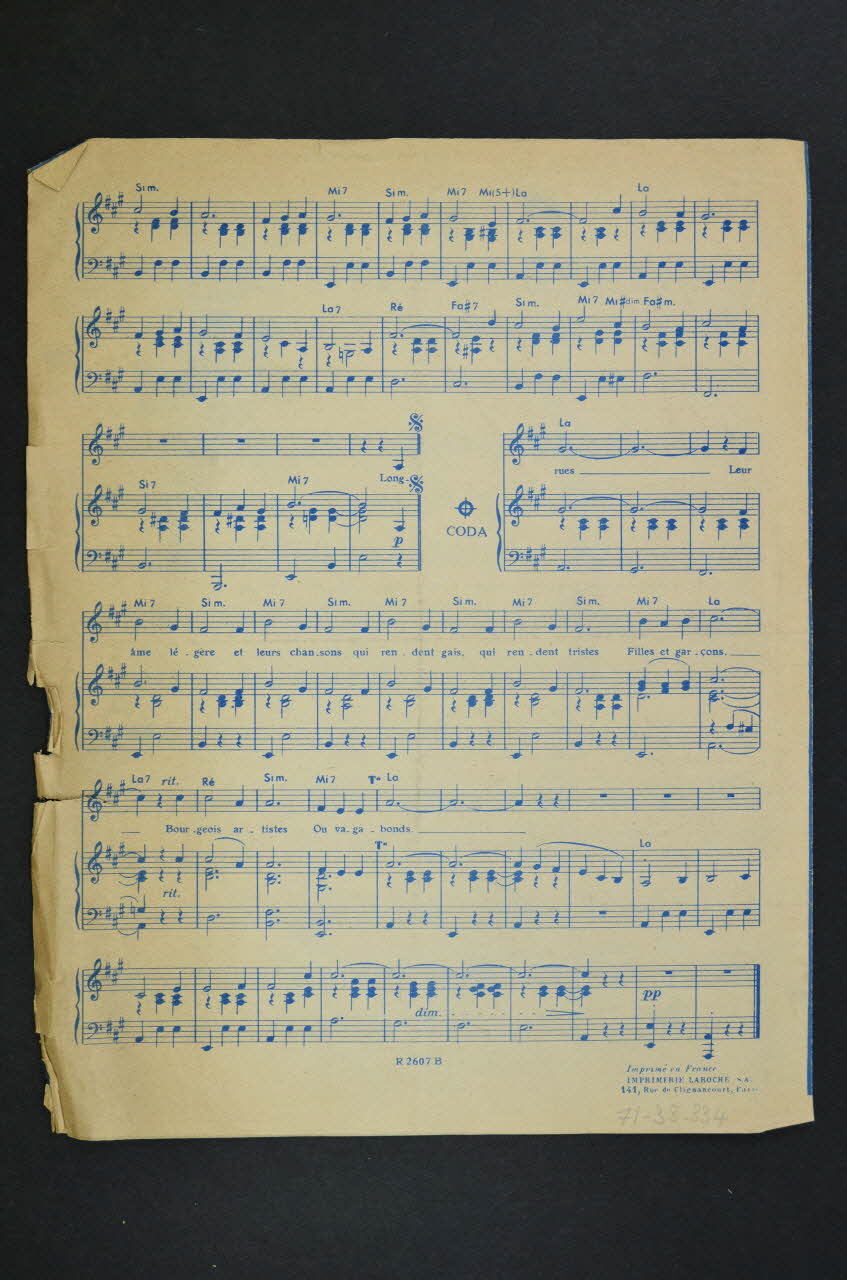 Des inscriptions renseignent le titre, les auteurs, les exécutants et l'éditeur. A l'intérieur et au dos, partition et paroles de la chanson.Matériaux et techniques