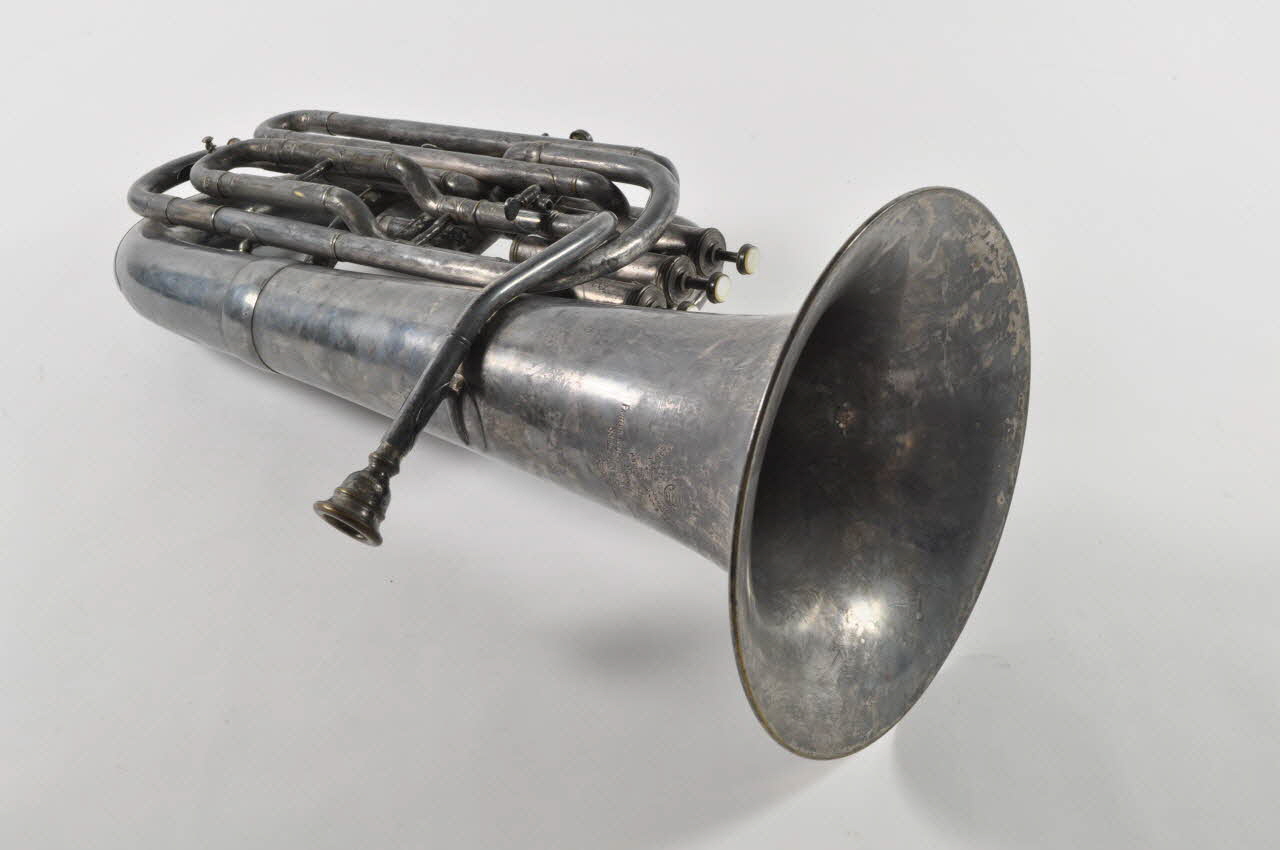 En cuivre argenté. A cinq pistons avec boutons en nacre, deux pistons devant et trois dessus. Une clé d'eau. Nombreuses coulisses, coulisse d'accord.