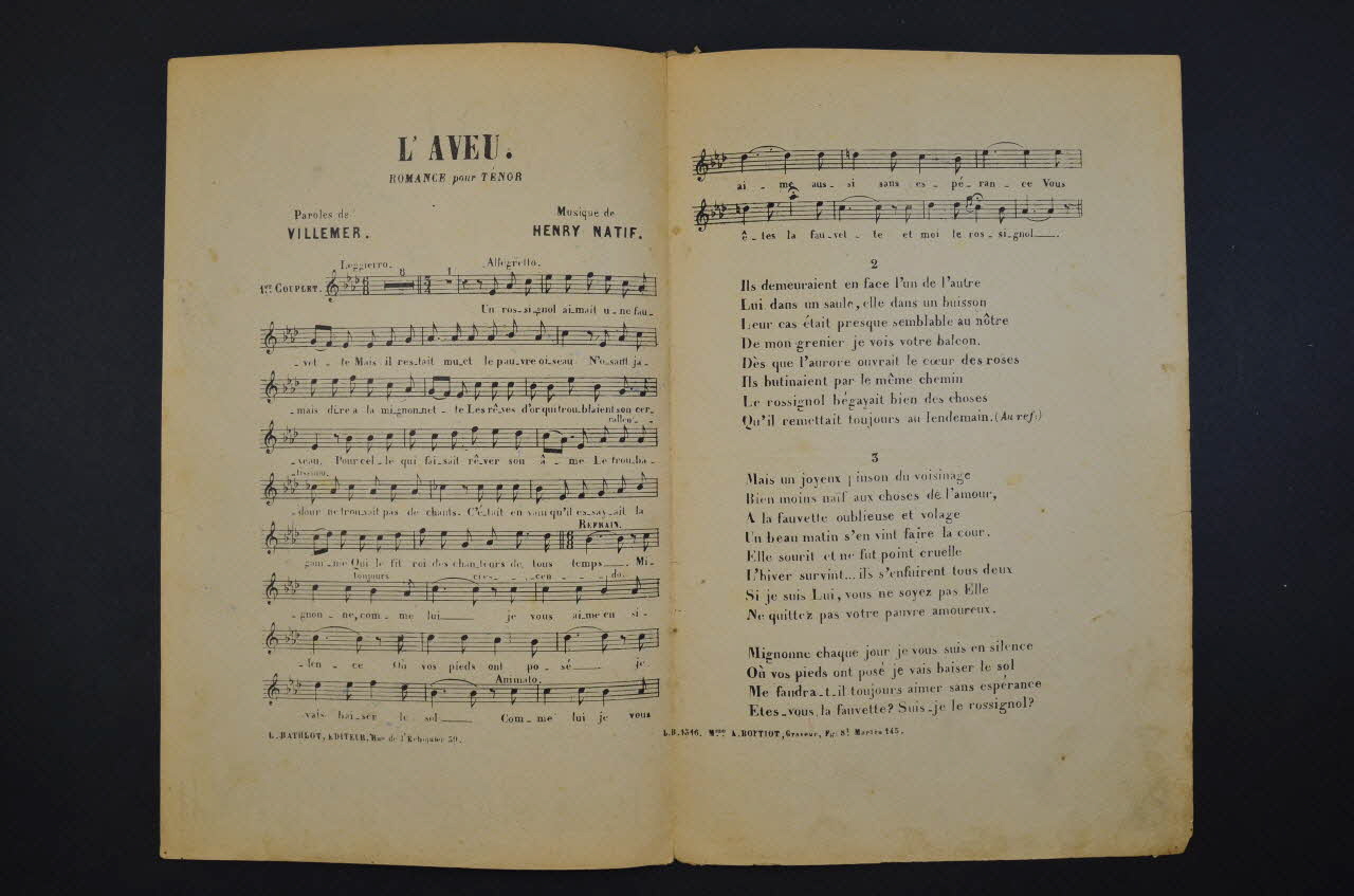 Les inscriptions précisent l'auteur de la chanson, les interprètes et l'éditeur du feuillet. L'intérieur comporte la partition et les paroles. Au dos, une liste d'autres titres disponibles chez le même éditeur.Matériaux et techniques