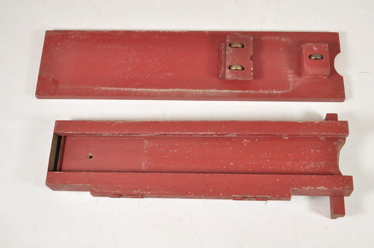 Une planche placée au dessus (.1) supporte le corps du comdamné. Etroite, elle se place d'abord à la verticale puis bascule à l'horizontale pour coulisser sur son support (.2) et ammener le corps jusqu'à la lunette (1982.50.2.13). Elle présente ainsi deux éléments rectangulaires dessous, un présentant deux roulettes en laiton au centre, l'autre une roulette en fer, permettant ainsi à la planche de coulisser sur sa base. Deux charnières sont disposées en bordure, permettant la fixation de la planche 1982.50.2.15.3. Les extrémités sont renforcées de pièces de fer peintes. Une seconde planche (.2) supporte la première et permet un coulissement de l'élément comportant les roulettes en laiton grâce à deux rainures tout le long des deux bords.Matériaux et techniques