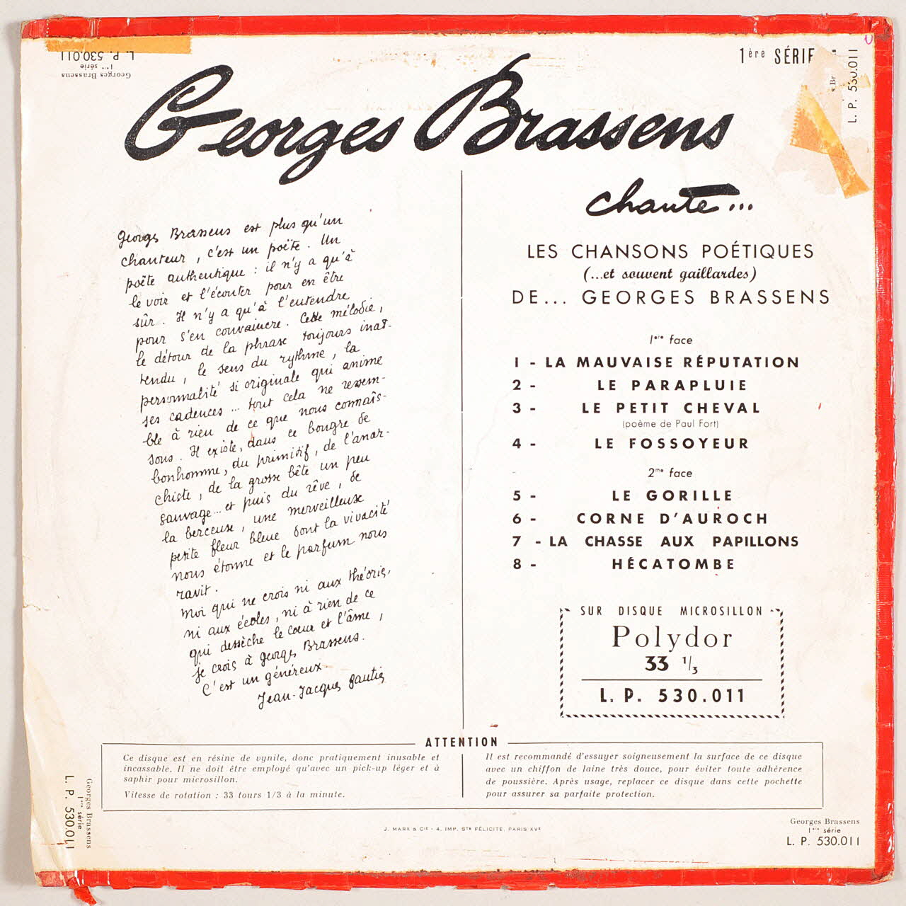 disque 33 tours, Le fossoyeur, La mauvaise réputation, Le gorille, La chasse aux papillons, Georges Brassens chante les chansons poétiques (...et souvent gaillardes) de... Georges Brassens, Corne d'Auroch, Le parapluie, Hécatombe, Le petit cheval