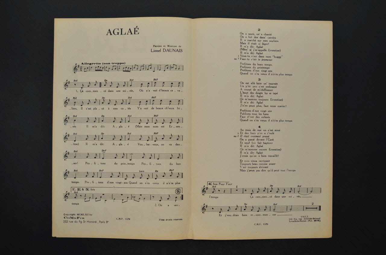 Sur la couverture, le portrait photographique d'Aglaé dans un cadre rectangulaire à décor de rinceaux. Les inscriptions renseignent le titre de la chanson, le nom des auteurs, de l'artiste et de l'éditeur. A l'intérieur, partition et paroles de la chanson. Au dos, liste d'autres partitions publiées par l'éditeur.Matériaux et techniques