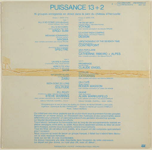 6641 037 (référence de l'album)disque 1, face 1 : // - Ergo Sum, All's so comic (Introduction) // - Ergo Sum, All's so comic // - Magma, Mekanik Kommando // - Spectre, Arkham // disque 1, face 2 : // - Mor, Un hini a garan // - Mor, Here's to you // - Zabu, Informer Blues // - Solitude, Been gone so long // - Steve Warring, Bill Bailey // // disque 2, face 1 : // - Voyage, I'm on my way // - Design, Ils n'ont rien compris // - Contrepoint, Unfathomable of the seventh time // - Catherine Ribeiro + Alpes, Aria populaire // disque 2, face 2 : // - Claude Engel, Promenade // - Catharsis, Charles // - Roger Masson, On a tapé // - Alain Markusfeld, Iguane (titre des chansons // 17 titres)Décor