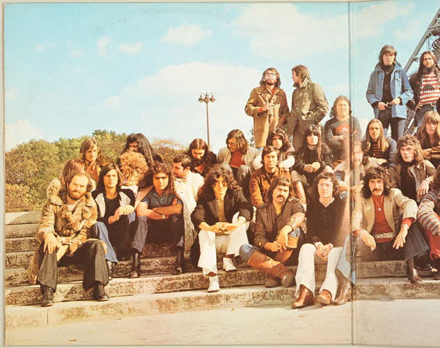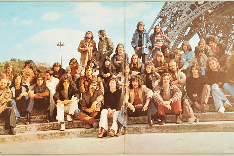 enveloppe de protection en papier / pochette en carton / disque en vinyle / pochette double - fond gris pâle et inscriptions bleues au recto et au verso - photographie en couleur, au pied de la tour Eiffel, des musiciens ayant participé à l'enregistrement / disques vinyles de couleur noire - inscriptions blanches sur fond noir sur la partie centraleInscriptions
