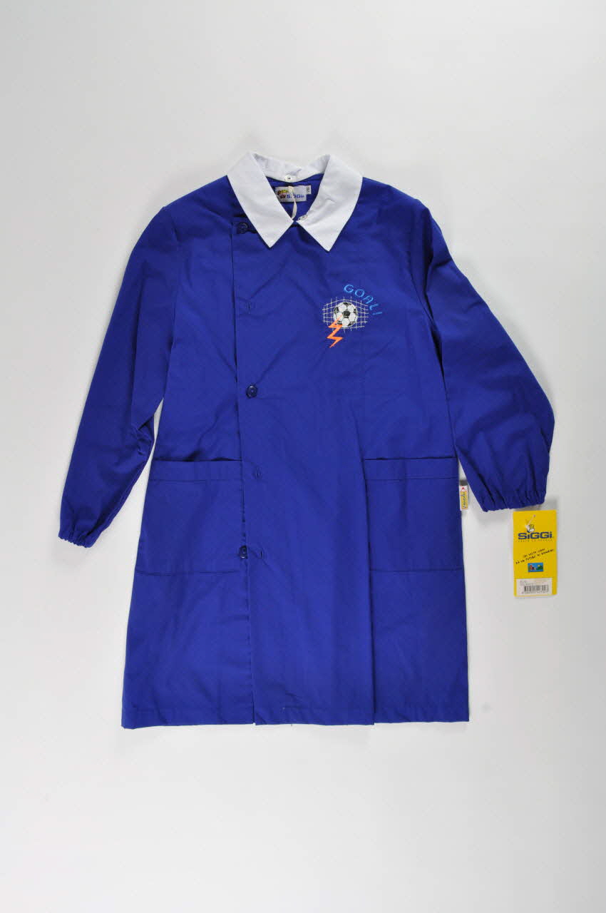 Longue blouse, droite, en toile de coton bleue, à petit col amovible, pointu en coton blanc. Les manches longues sont froncées dans le bas par un élastique. Une ceinture, fixée à l'arrière, resserre la blouse. Deux poches carrées sont plaquées à l'avant, dans le bas. La poitrine est ornée d'un ballon de football, dans un filet de but, brodé sur le côté gauche.