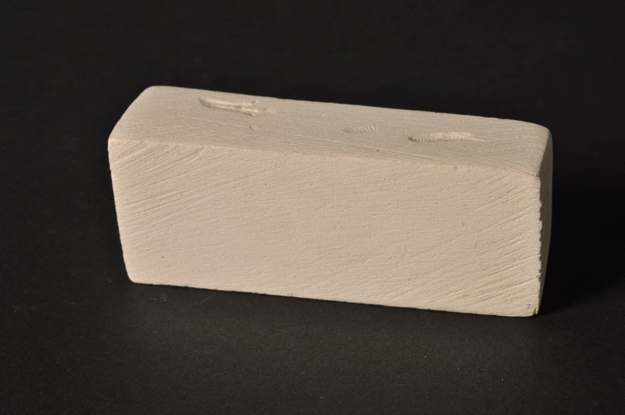 Parallélépipède rectangle, légèrement irrégulier, en plâtre cuit. Il présente des traces d'outil sur toutes ses faces.