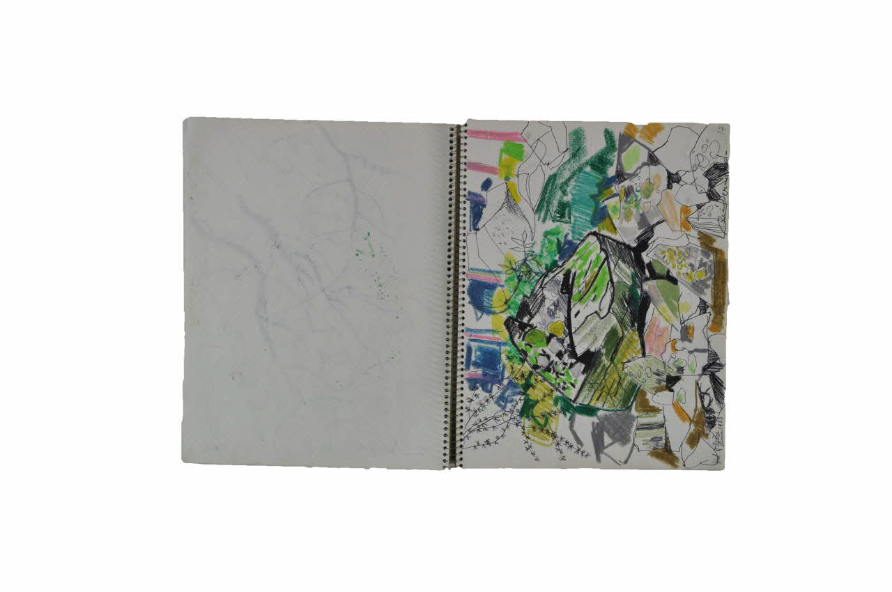 La couverture et la quatrième de couverture sont en papier cartonnées, de couleur ocre. La couverture comporte des inscriptions au feutre noir et rouge. Le carnet est composé de trente quatre pages contenant des dessins de paysages urbains composés de petites habitations, et de végétaux. Ils sont tous signés, certains sont annotés et la pluparts sont réalisés au stylo à bille noir et au pastel gras. Toutes les pages sont numérotées dans le coin supérieur droit du recto des feuilles. Le reste du carnet est resté vierge.Inscriptions