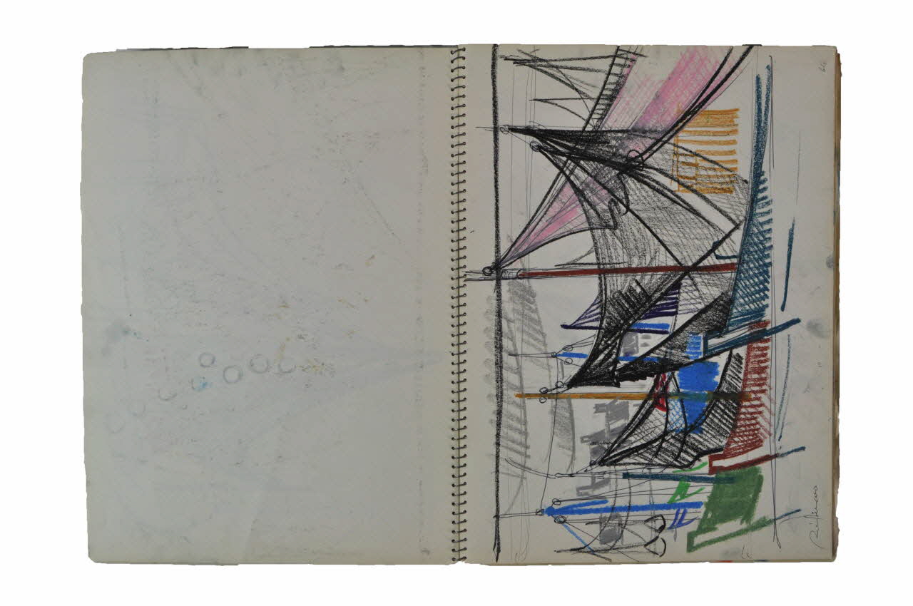 Vingt pages comprennent des dessins au pastel, à l'aquarelle et à la gouache. Les huit dernières pages sont vides. Une page illustrée est détachée et glissée à la fin du carnet. Ce carnet contient essentiellement des dessins marins (voiles, barques, mer) transcrits avec une palette hautement colorée, récurente chez l'artiste. Les dessins sont pour la plupart signés au stylo noir. Sur certains sont notés le nom du lieu reproduit et/ou l'année de la réalisation (deux derniers chiffres). La couverture de devant présente des inscriptions notées au feutre noir. Il s'agit du nom des lieux visités par l'artiste suivis des différentes années. Le nom de l'artiste est noté dans le bas. Un coeur est présent dans l'angle supérieur gauche ; en bas à droite se trouve un "E" placé dans un cercle. Une marque de fabrique est présente dans le haut au centre de la couverture de devant ; un tampon est visible dans le bas de la quatrième page de couverture.Inscriptions