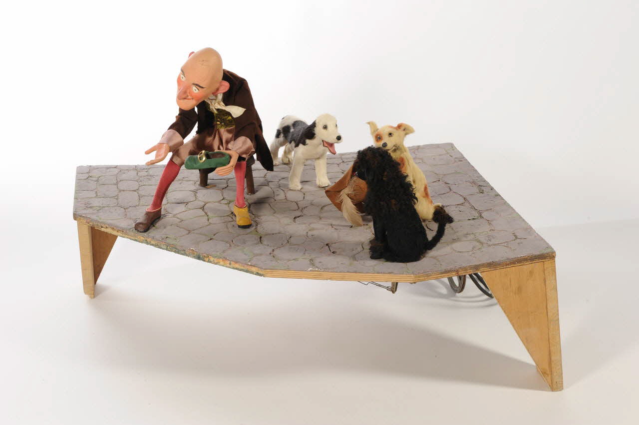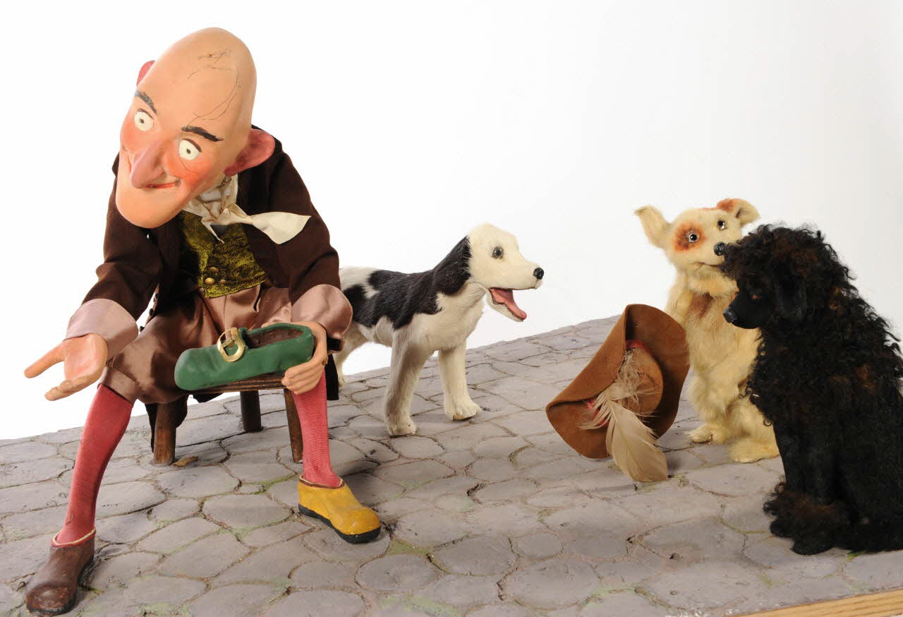 Un personnage masculin, âgé a trois cheveux sur la tête et porte un chaussure. Il est assis et à côté de lui se trouvent trois chiens.Décor
