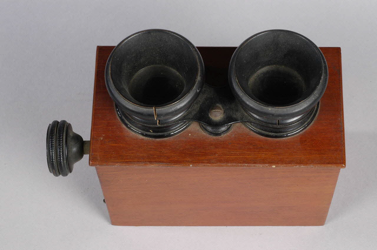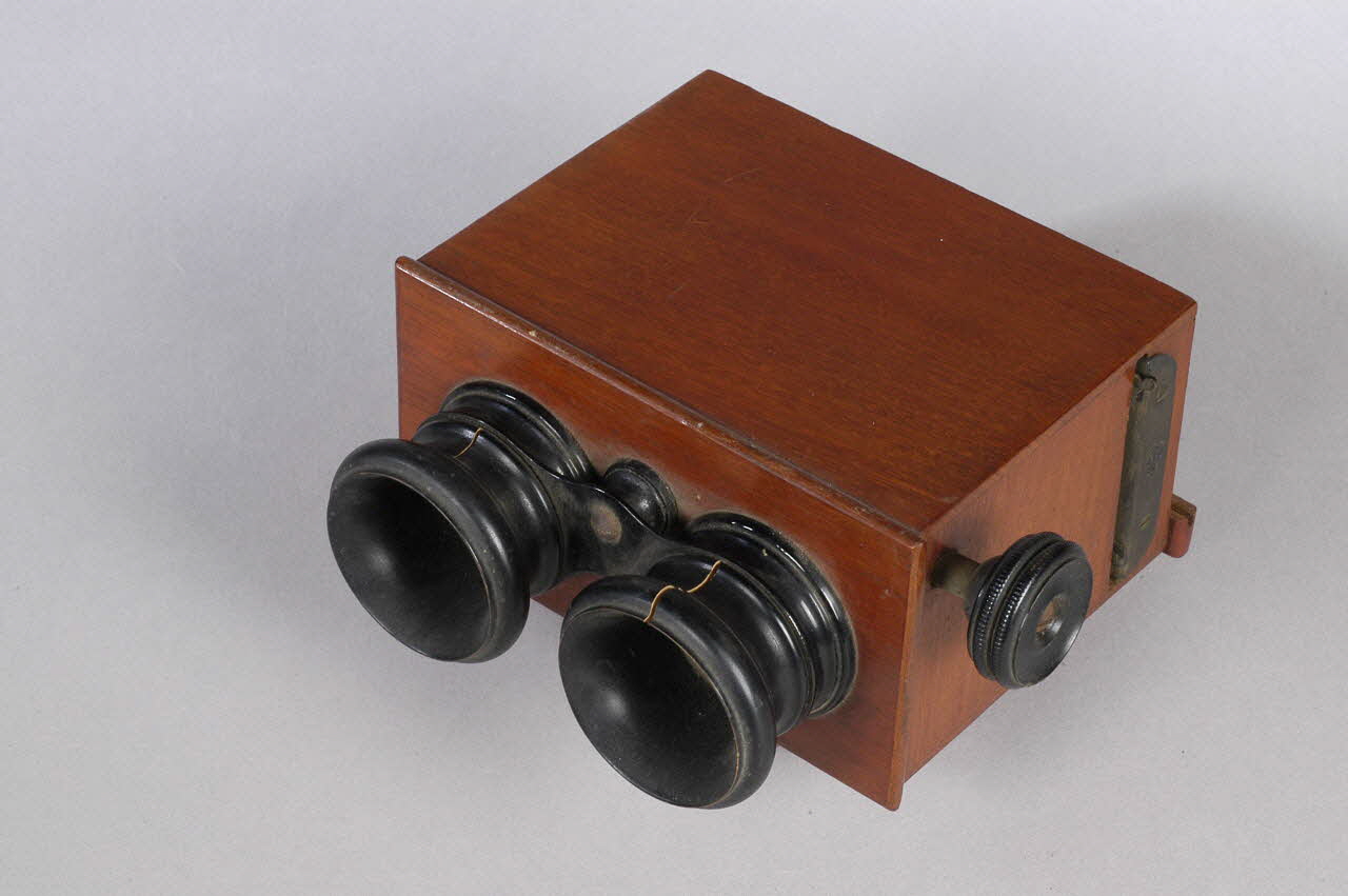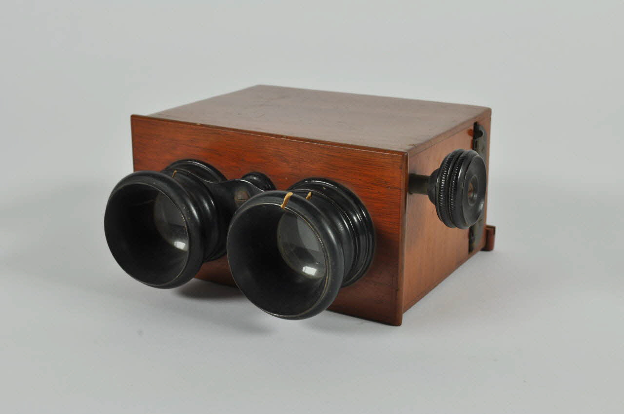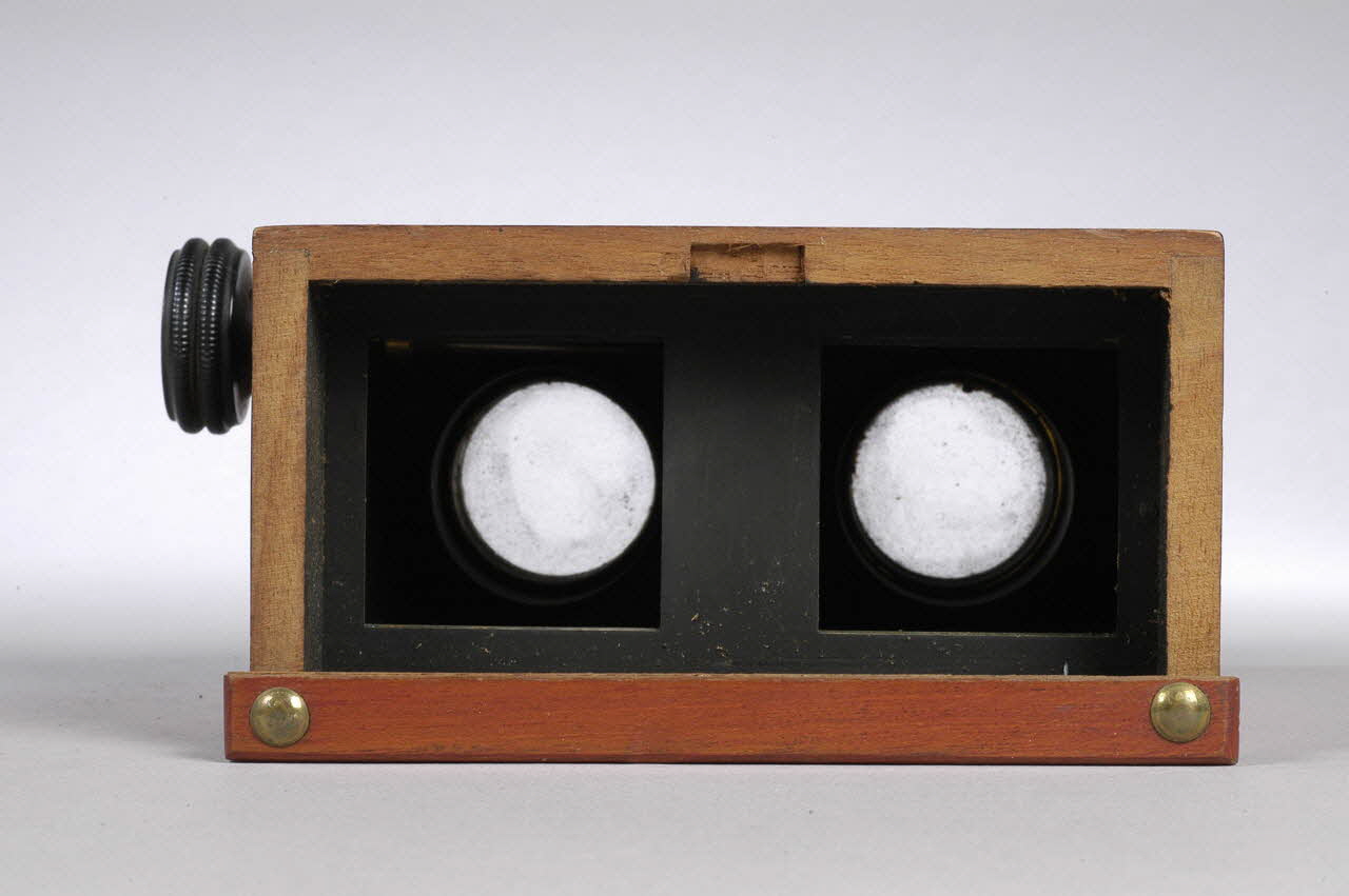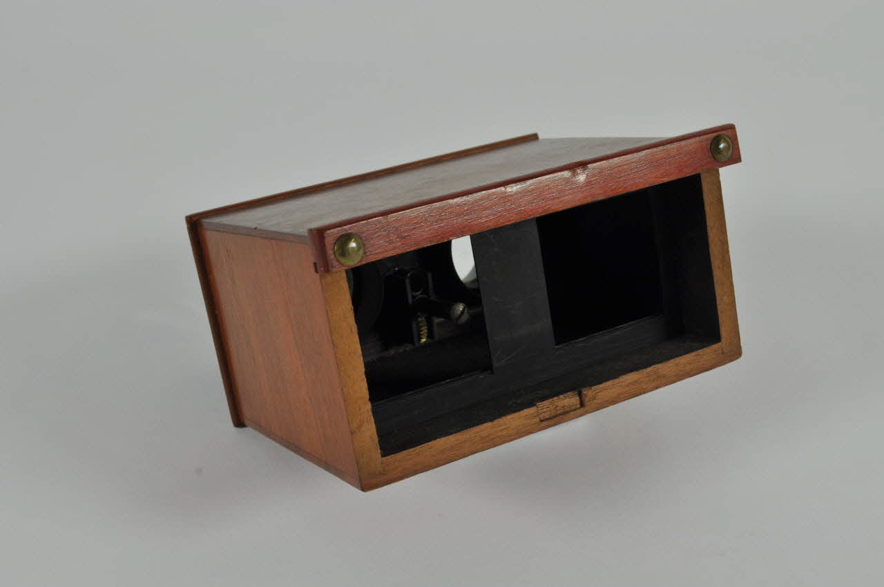 Boîte rectangulaire en bois verni, avec deux oculaires en verre cerclé de bois et métal peints en noir et un bouton de réglage, à une extrémité. A l'autre extrémité, système de fermeture à charnières.Matériaux et techniques