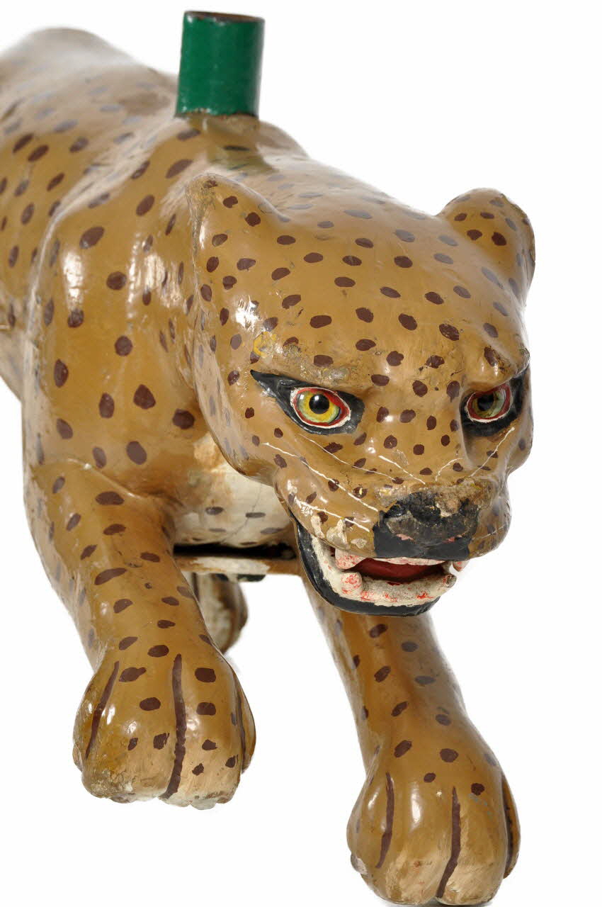 Ronde bosse en bois sculpté et peinte, représentant une panthère bondissante, faisant partie d'un manège.