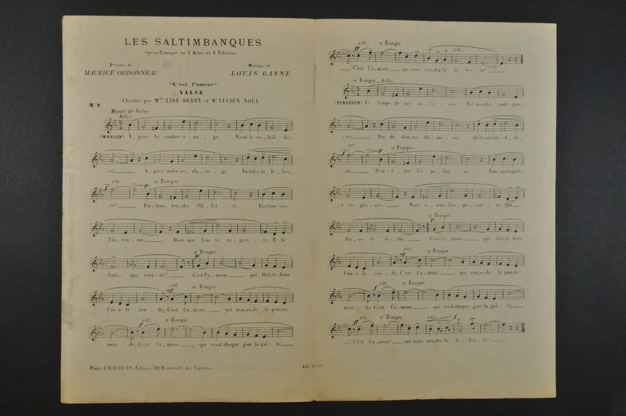 Des inscriptions renseignent le titre, les auteurs, les exécutants et l'éditeur. A l'intérieur, les paroles et la partition. Au dos, une liste de titres disponibles chez le même éditeur.Matériaux et techniques