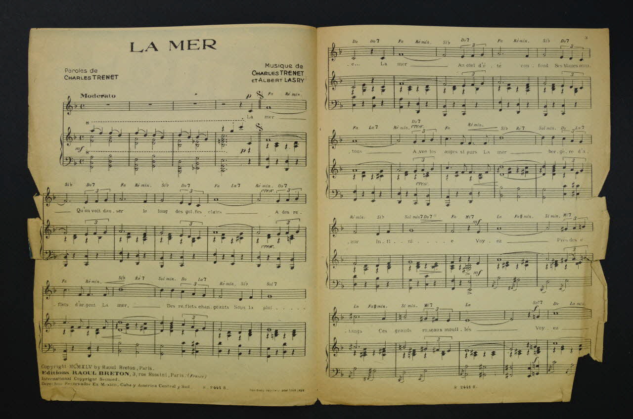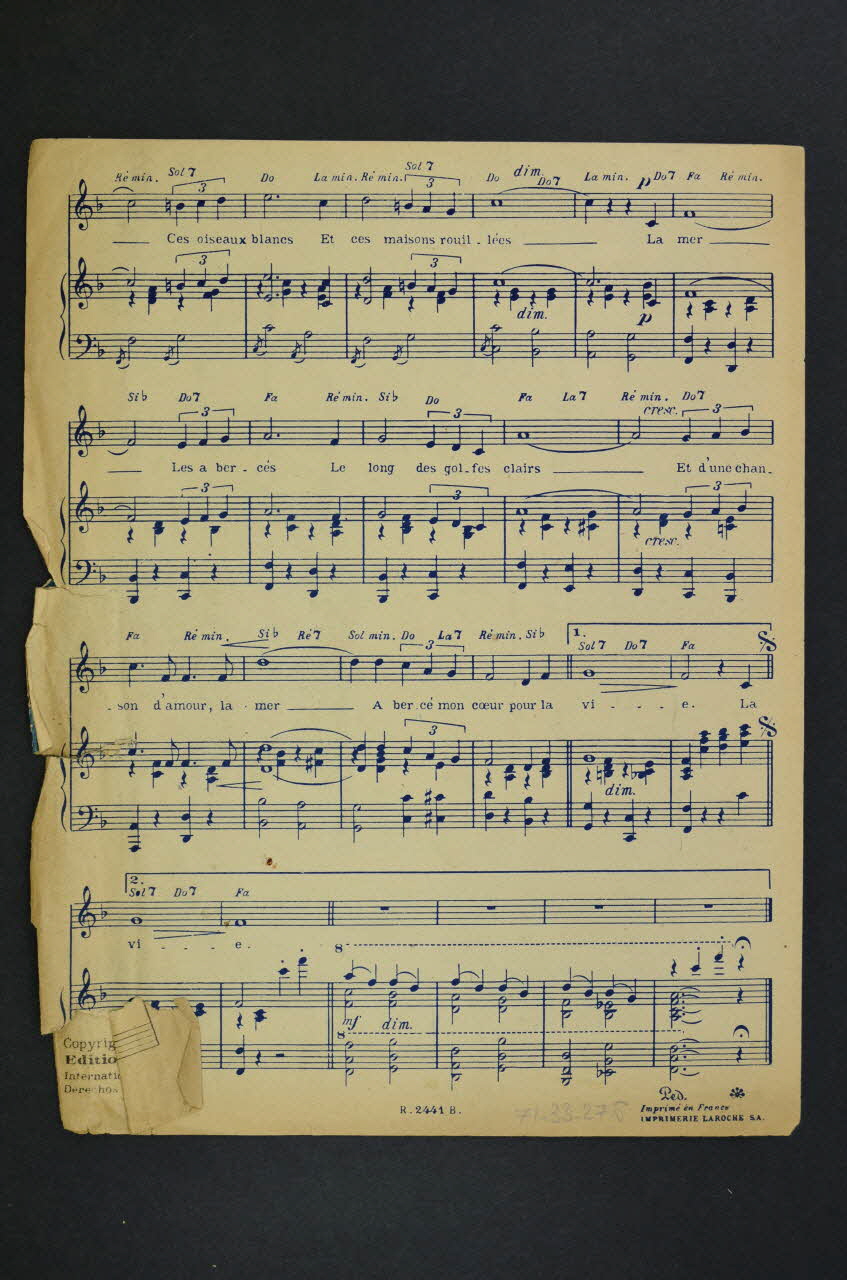 Des inscriptions renseignent le titre, les auteurs, les exécutants et l'éditeur. A l'intérieur et au dos, partition et paroles de la chanson.Matériaux et techniques
