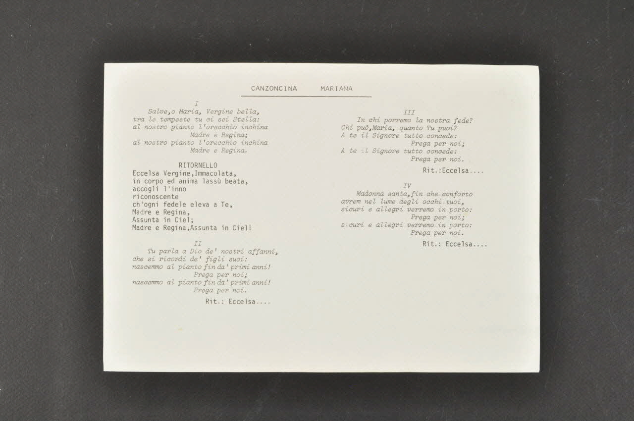 Paroles d'un cantique intitulé "Canzoncina mariana", composé à l'occasion des "rites" de 1975 dans les quartiers de Portella.Inscriptions