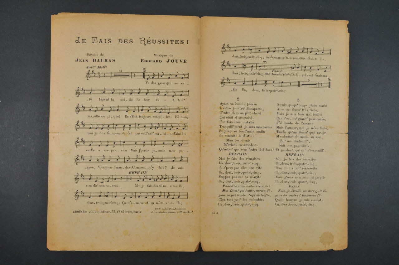 Des inscriptions renseignent le titre, les auteurs, les exécutants et l'éditeur. A l'intérieur, partition et paroles de la chanson. Le dos est laissé vierge.Matériaux et techniques
