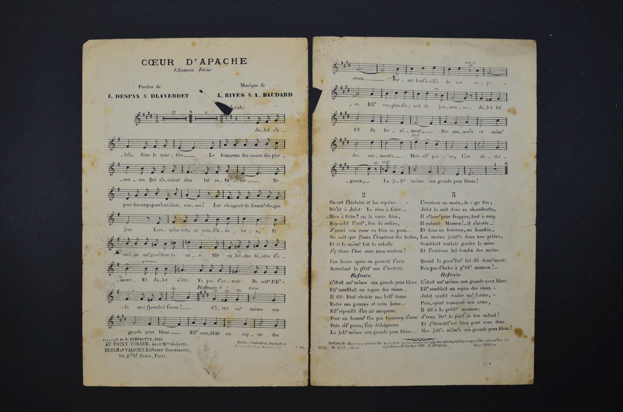 Des inscriptions renseignent le titre, les auteurs, les différents exécutants de la chanson et l'éditeur. A l'intérieur, partition et paroles de la chanson. Au dos, liste d'autres partitions publiées par l'éditeur.Matériaux et techniques