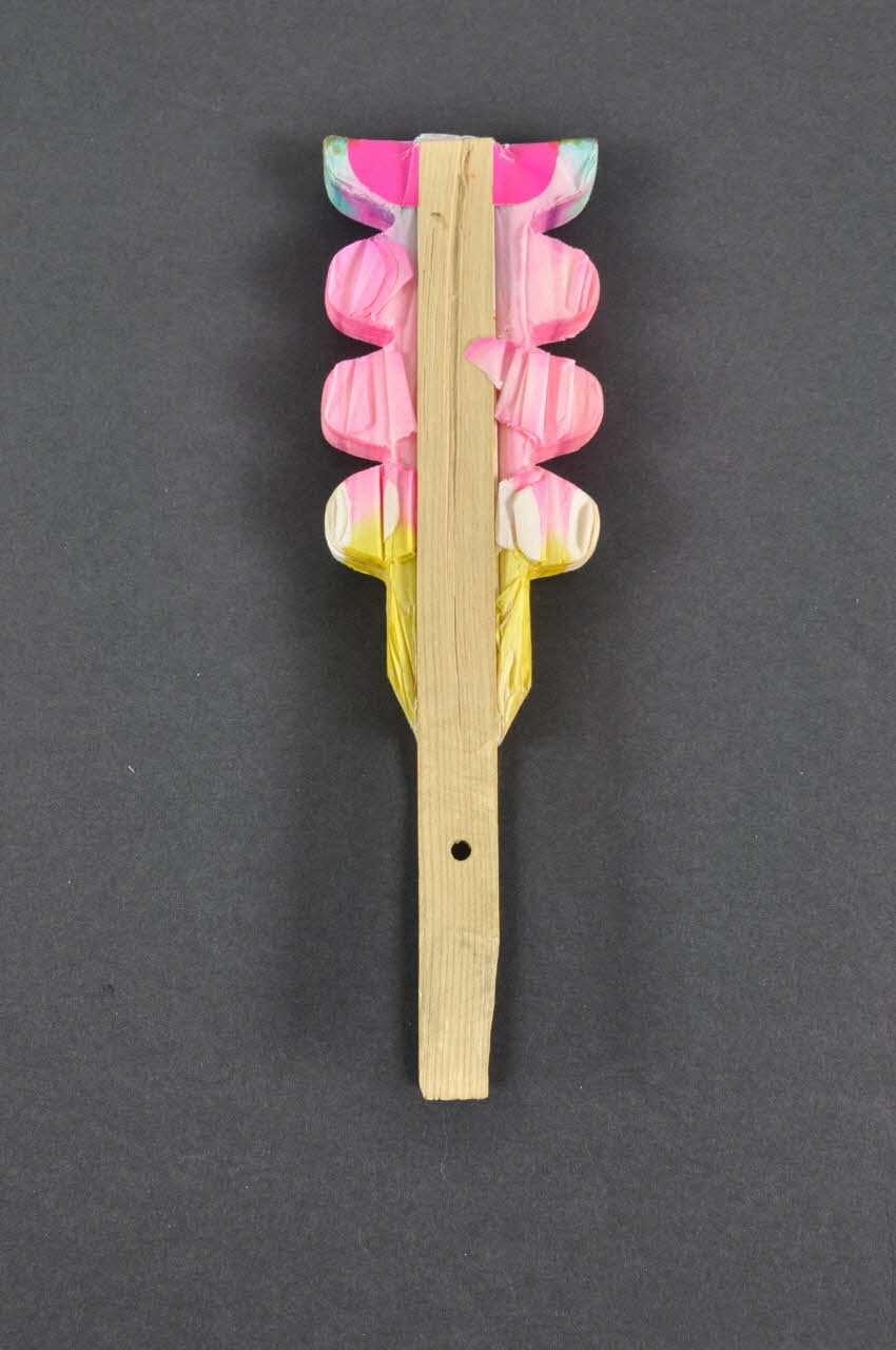 Eventail circulaire, en papier, teint de cercles concentriques rose, jaune, blanc et bleu, maitenu par deux baguettes de bois plates, percées d'un trou sur l'extrémtié. L'éventail est conservé plié.Matériaux et techniques