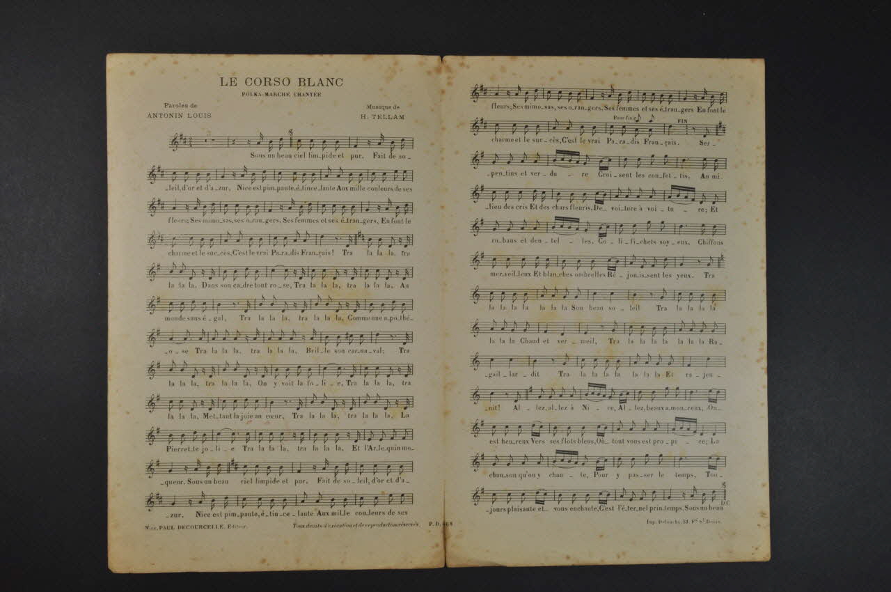 Des inscriptions renseignent le titre, les auteurs, les exécutants et l'éditeur. A l'intérieur, partition et paroles de la chanson. Le dos est laissé vierge.Matériaux et techniques