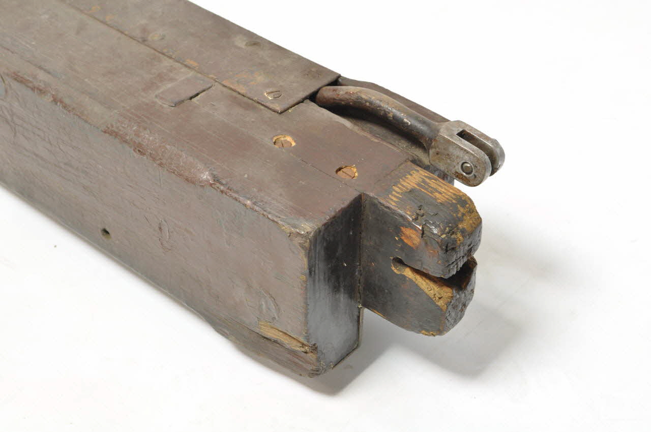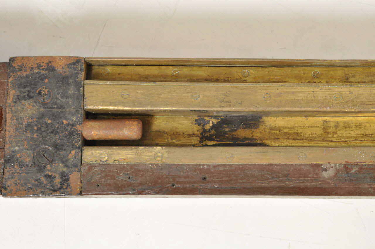 Au centre, sur un côté, une pièce de fer vissée marque l'emplacement de la traverse en fer (1982.50.1.10.3) reliant les deux montants. (1982.50.1.9-10).Matériaux et techniques