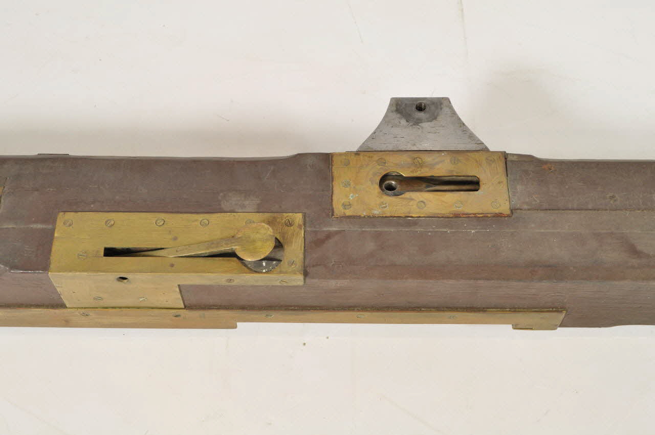 Montant vertical droit de la guillotine, en chêne taillé et peint en bordeau. A l'extrémité inférieure, un tenon s'imbriquant à la base (1982.50.1.1) et se fixant par une charnière en fer. A l'extrémité supérieure, un trou de vis au centre d'un tenon, ainsi qu'une pièce en fer, pour fixer la rainure (1982.50.1.14). La pièce de fer permet d'actionner le mécanisme de la rainure. Sur un côté, sur toute la longueur, une large rainure recouverte d'une feuille de laiton vissée, pour le passage du mouton (1982.50.1.11). A l'extrémité de la rainure, une pièce de fer à section circulaire s'imbrique dans le ressort (1982.50.1.10.2). Parallèlement, une seconde rainure laisse coulisser les deux parties de la lunette (1982.50.1.17). Des trous de boulons en fer sur les côtés, afin de fixer les barres de fer (1982.50.1.4 et 1982.50.1.6) à l'avant et à l'arrière de la base (1982.50.1.1) et une barre latérale (1982.50.1.8) se fixant sur la partie inférieure de la base (1982.50.1.2).