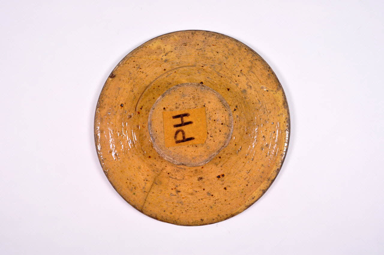 Couvercle en terre cuite façonnée au tour, circulaire, présentant une petite protubérance cylindrique sur le dessus. Le couvercle est légèrement convexe, et couvert d'une glaçure opaque jaune.Décor