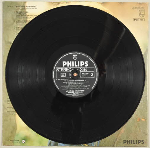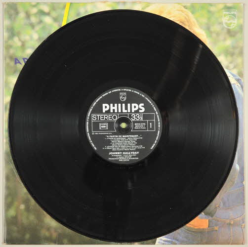 disque en vinyle de couleur noire / pochette en carton / enveloppe de protection en papier blanc / Au recto et au verso de la pochette, photographie en couleur de Johnny Hallyday, en extérieur (fond flou) portant une veste en jean / inscriptions sur la partie centrale du disque en gris sur fond noirInscriptions