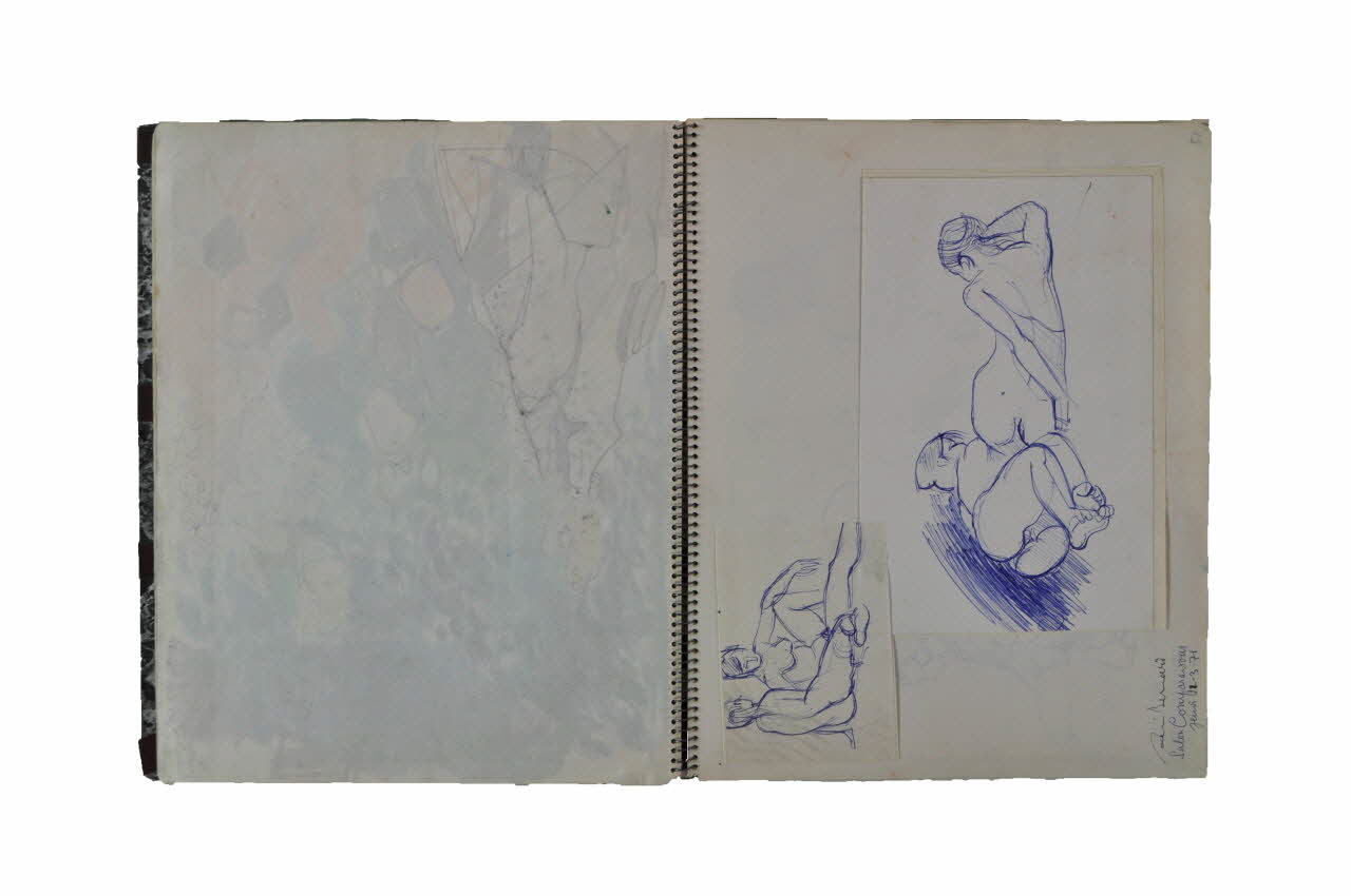 La couverture est soupple, recouverte d'un papier imprimé et la quatrième de couverture est rigides, cartonnée, également recouverte du même papier imprimé. Elles sont maintenues par de longues bandes de ruban adhésif brun. Soixante-neuf pages sont illustrées, une page est volantes et les trois dernières feuilles sont vierges. Au milieu du carnet, des pages ont été rapportées d'un autre carnet plus petit et collées. Ce carnet présente dans sa première moitié des scènes de plage, des personnes en tenu de bain et des paysages de bord de mer. La seconde moitié présente des études de nus. Ils sont pour la plupart fais au pastel graset au stylo à bille. Les techniques sont associées ou non. La pluârt des dessins sont signés, certains sont titrés et datés.Inscriptions