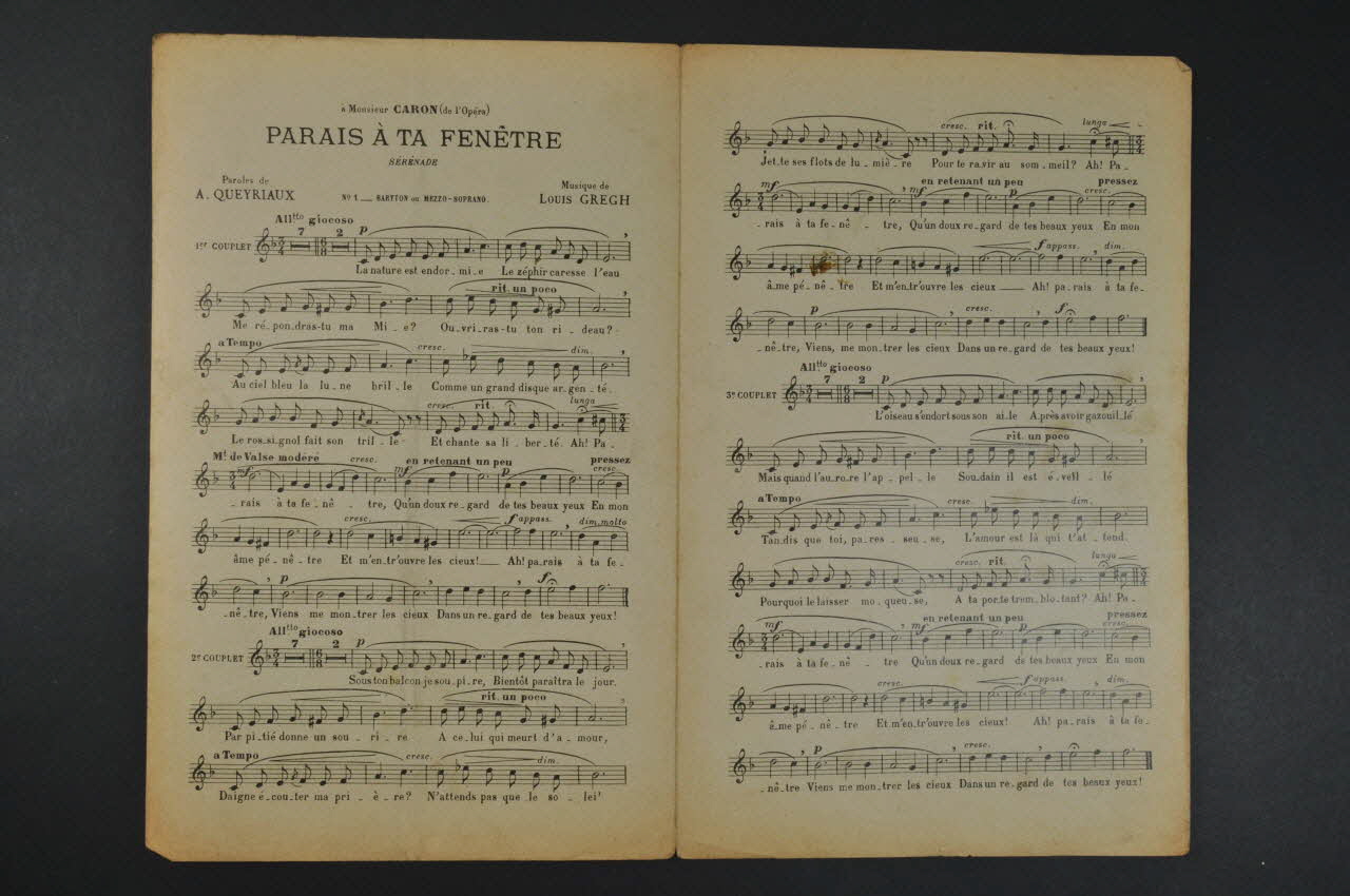 Des inscriptions renseignent le titre, les auteurs, les exécutants et l'éditeur. A l'intérieur, partition et paroles de la chanson. Au dos, liste d'autres partitions publiées par l'éditeur.Matériaux et techniques