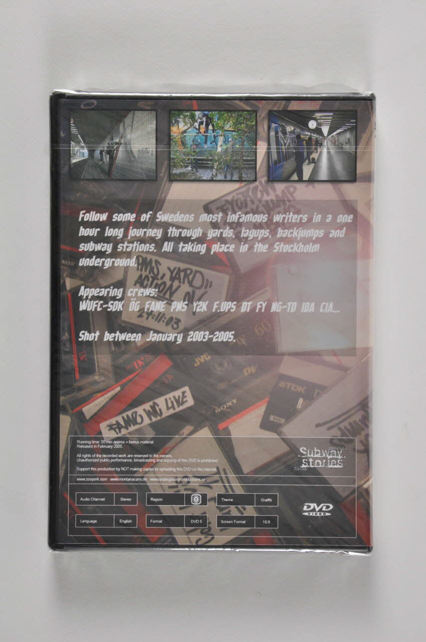 Follow some of Swedens most infamous writers in a one / hour long journey through yards, layups, backjumps ans / subway stations. all taking place in the Stockholm : underground. / Appearing crews : / WUFC-SOK ÖG FAME PMS Y2K F.UPS DT FY NG-TD IDA CIA... / Shot between January 2003-2005 / [..], dosMatériaux et techniques