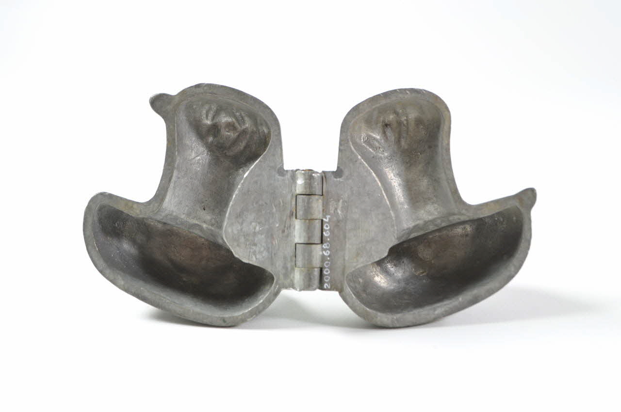 Il s'agit d'un moule bivalve de confiseur. Il est réalisé en étain et comporte un assemblage par charnières.