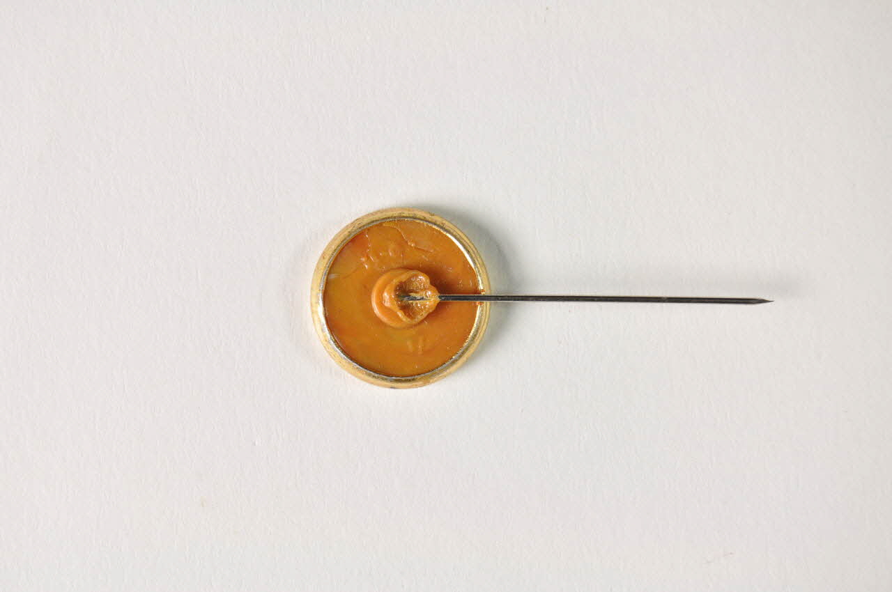 Cet objet est constitué de trois parties : un médaillon rond central représentant le portrait en buste noir et blanc d'un homme (ce médaillon est orange au revers) ; une bordure métallique dorée et arrondie qui encadre l'image ; une tige métallique collée au médaillon au revers et permettant de piquer ce dernier dans un support. Le portrait est sans doute celui d'un cosmonaute. Une inscription en russe est présente au revers.Décor