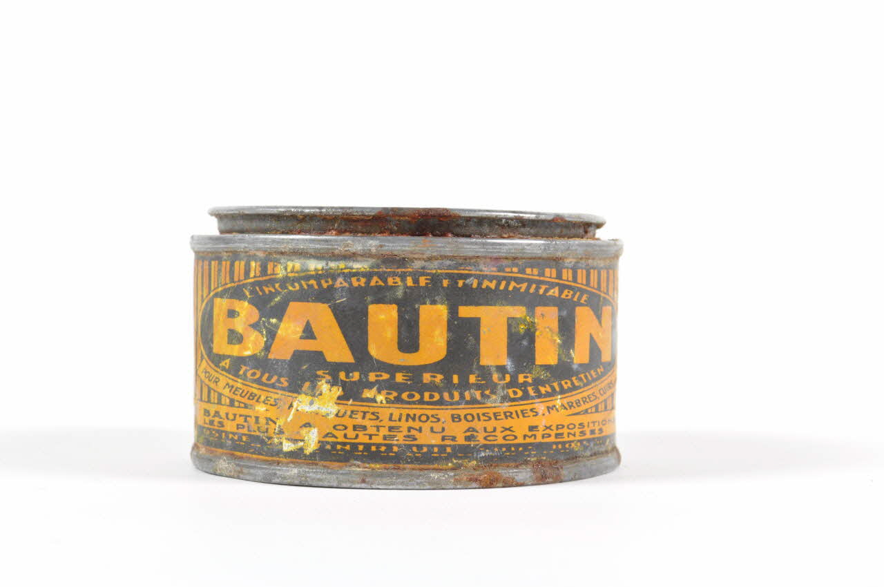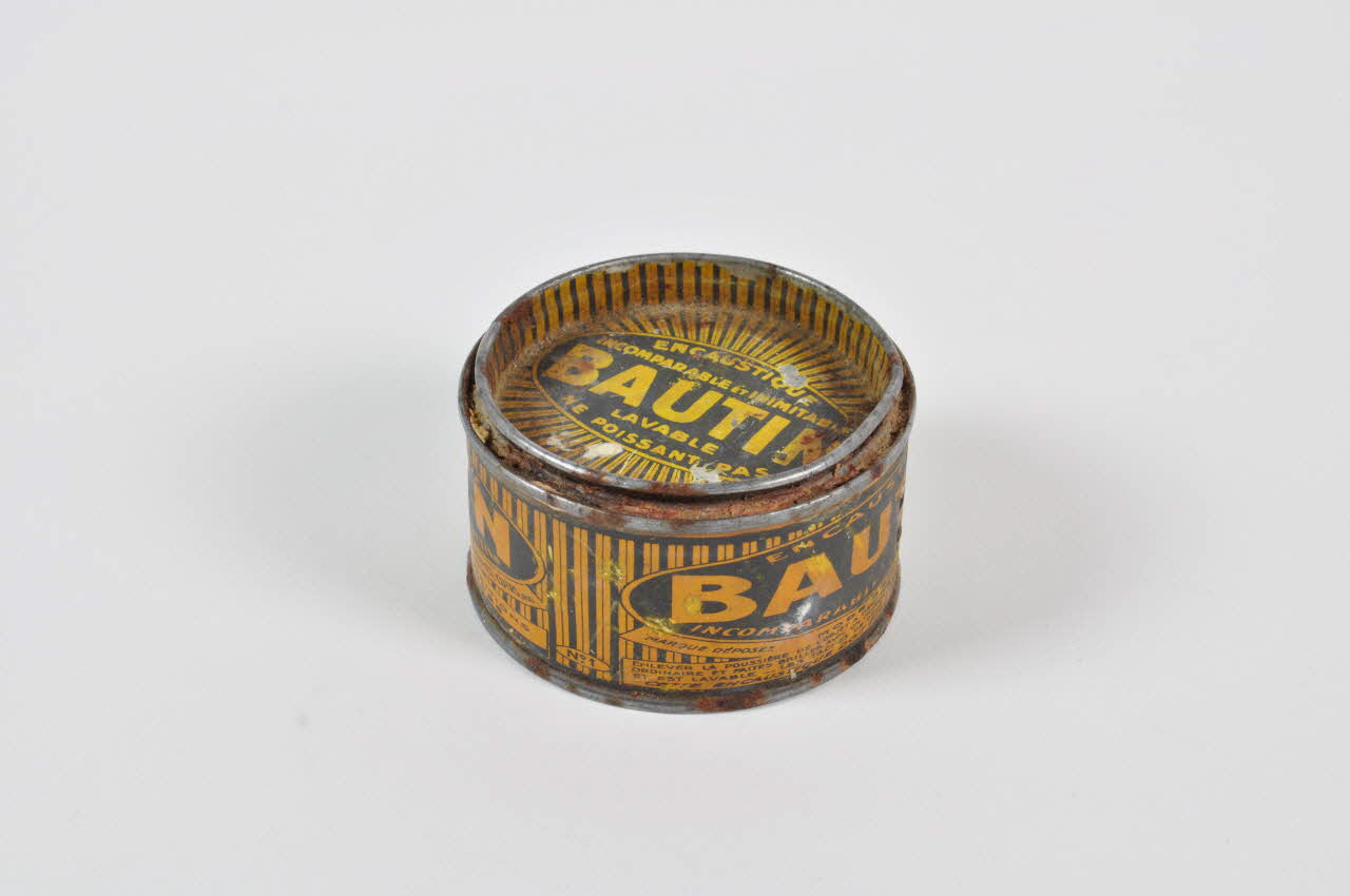 Boîte cylindrique en fer peint de rayures noires et jaunes, avec des inscriptions.Matériaux et techniques