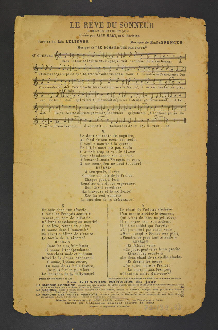 Des inscriptions renseignent le titre, les auteurs, les exécutants et l'éditeur. L'intérieur est laissé vierge. Au dos, la partition et les paroles de la chanson.Matériaux et techniques