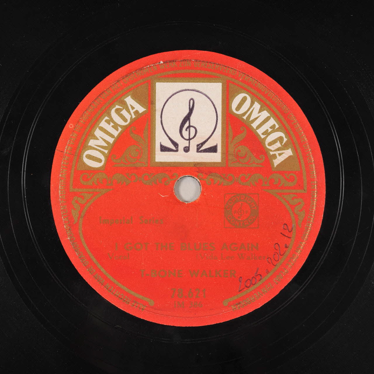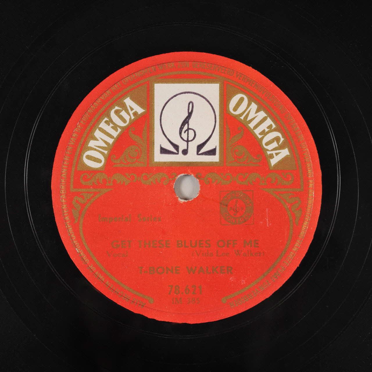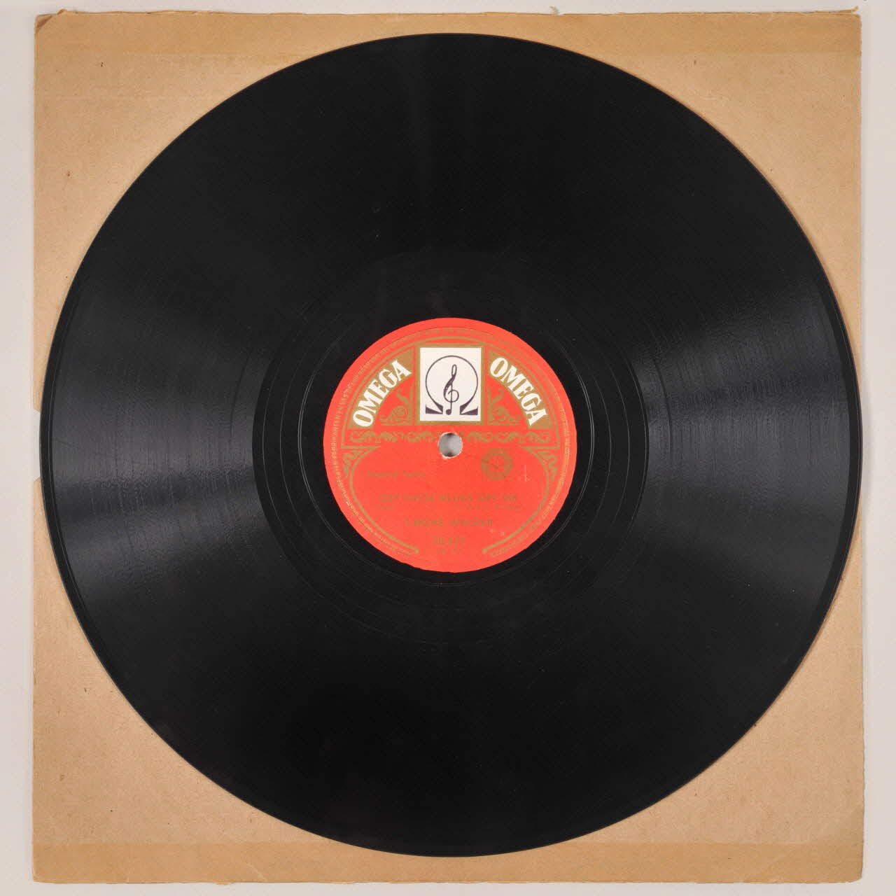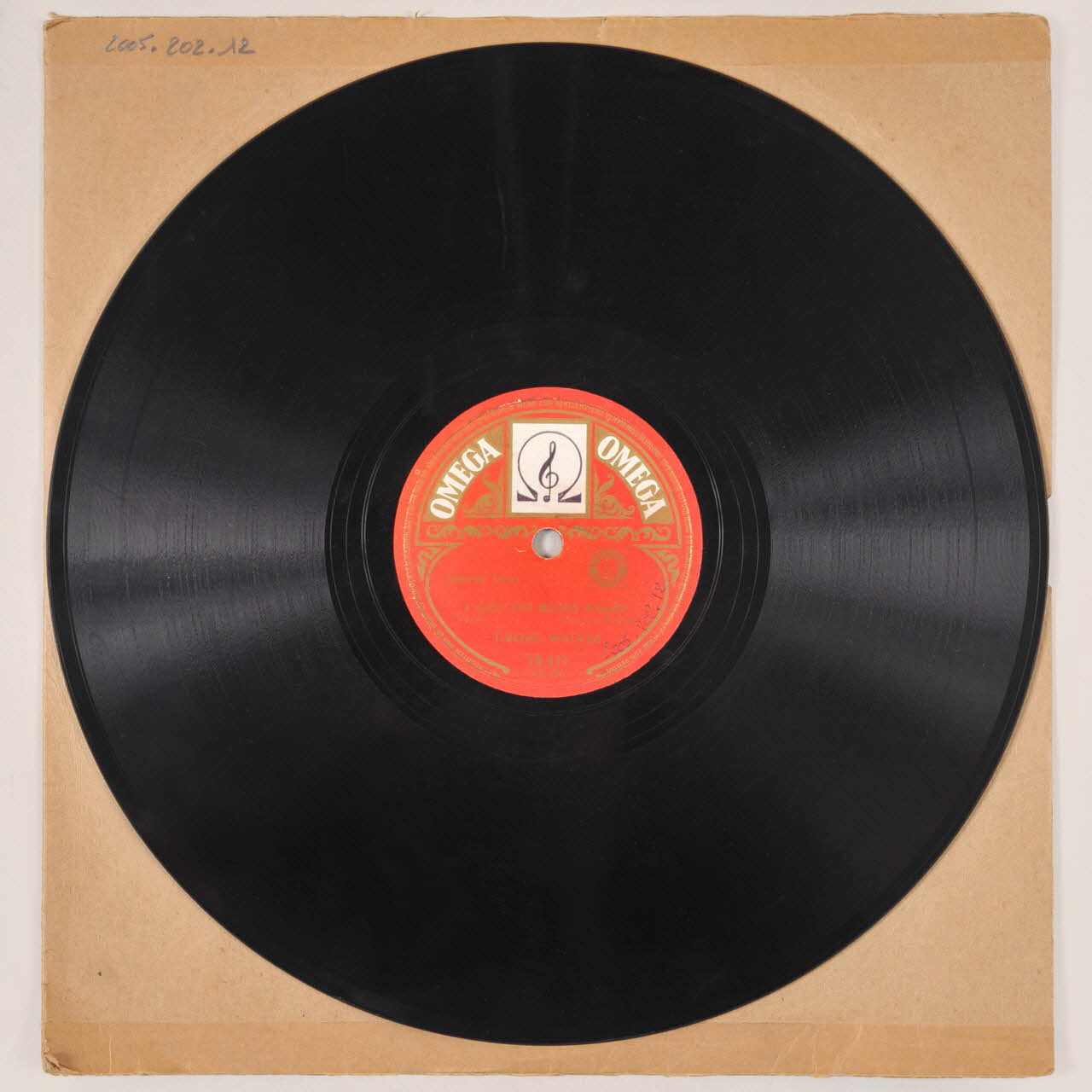 disque en vinyle de couleur noire / Au centre du disque, sur les deux faces, une étiquette circulaire en papier imprimé de couleur rouge avec une écriture dorée renseignant les titres, auteurs, exécutants et éditeur.