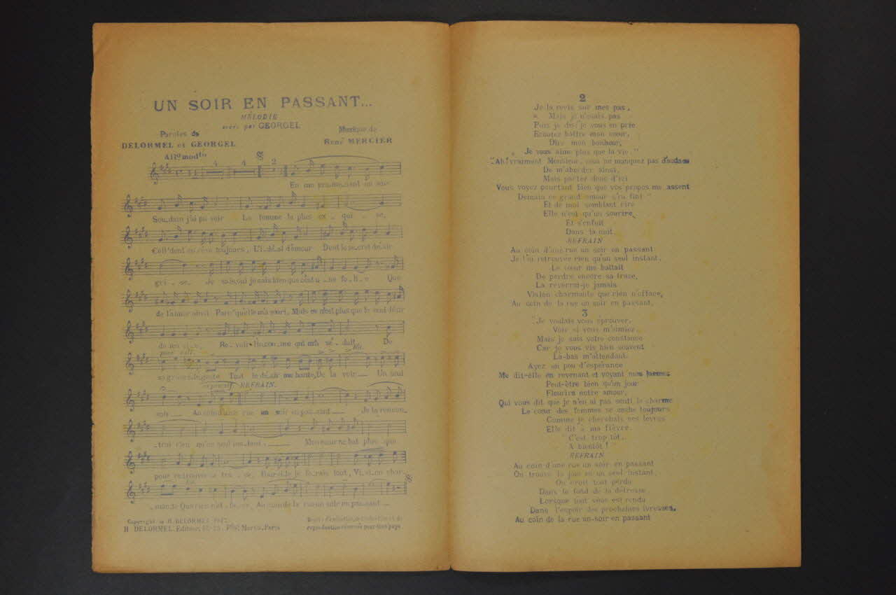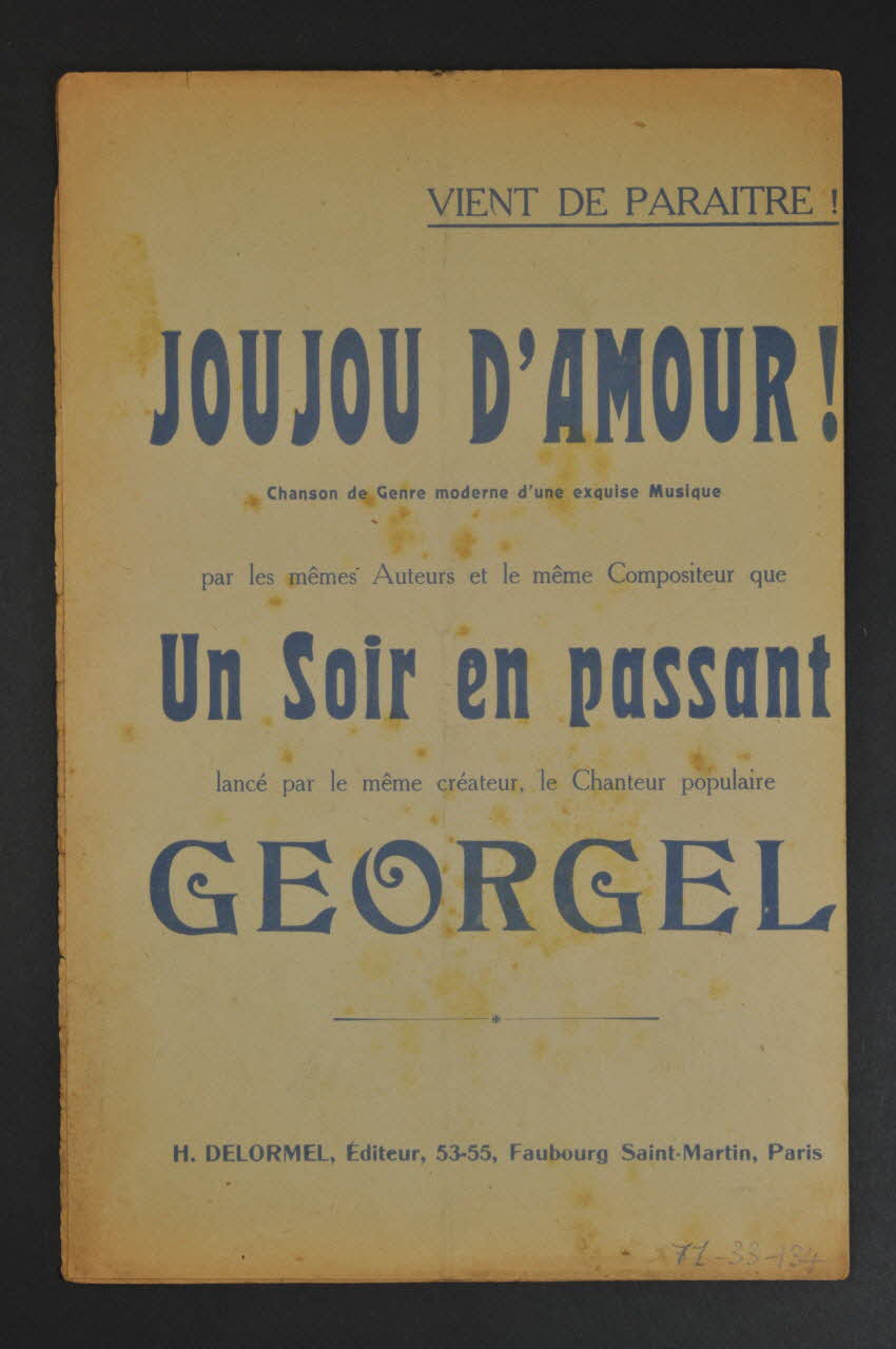 Les inscriptions renseignent le titre de la chanson, le nom des auteurs, de l'artiste et de l'éditeur. A l'intérieur, partitions et paroles de la chanson. Au dos, liste d?autres partitions publiées par l?éditeur.Dimensions et poids