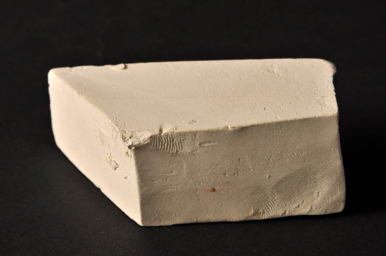 Elément de maquette, en plâtre, de forme trapézoïdale avec un petit côté biseauté. La surface est probablement marquée de traces d'outil.