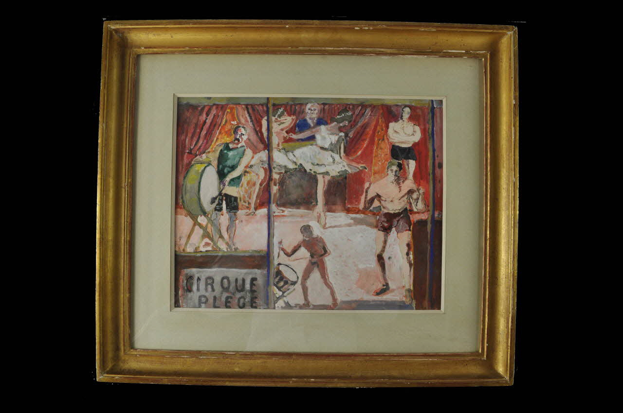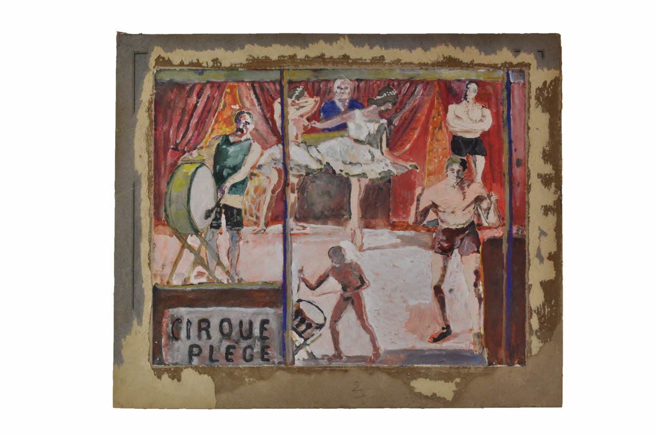 Sept personnages évoluent sur une piste avec des rideaux aux tons rouge et orangé comme seul décor. A gauche un homme joue d'un instrument de musique, probablement une grosse caisse. Un personnage masculin portant une veste bleue observe deux danseuses en tutus devant lui. A droite de la composition, deux hommes en short et torse nu sont l'un devant l'autre. Enfin, un dernier personnage, de proportion plus petite et jouant également d'une grosse caisse ferme la ronde. Deux cartons ont été collé ensemble. Plusieurs papiers ont été collé sur le revers. Deux rectangles de papier kraft ont été collé sur les bords supérieurs senestre et dextre du revers.Inscriptions