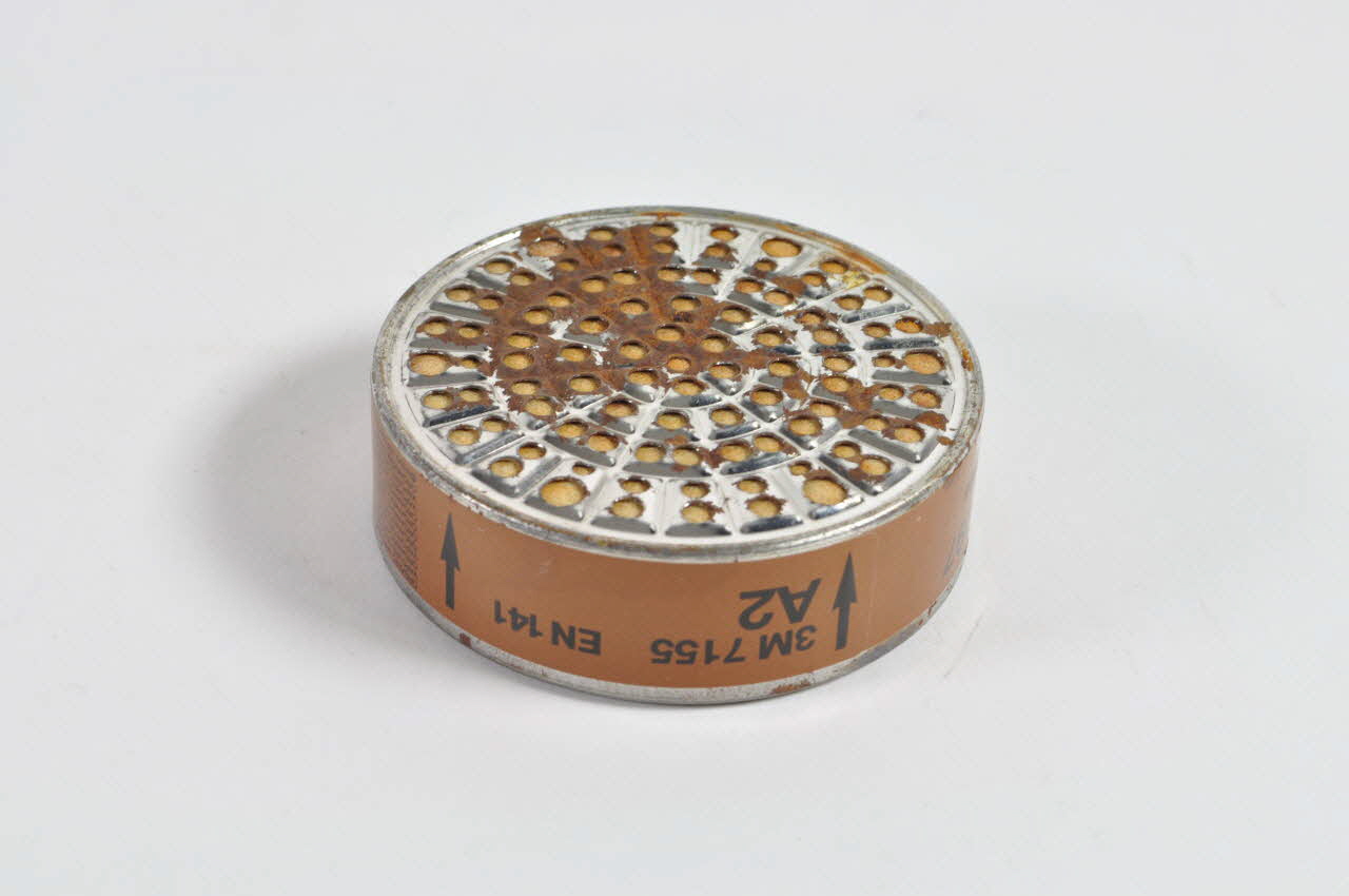 Filtre en fibres synthétiques jaunes, contenu dans un cylindre métallique, percé de grilles sur les deux faces. Une étiquette brune présentant le mode d'emploi est collé sur la tranche de l'objet.Matériaux et techniques