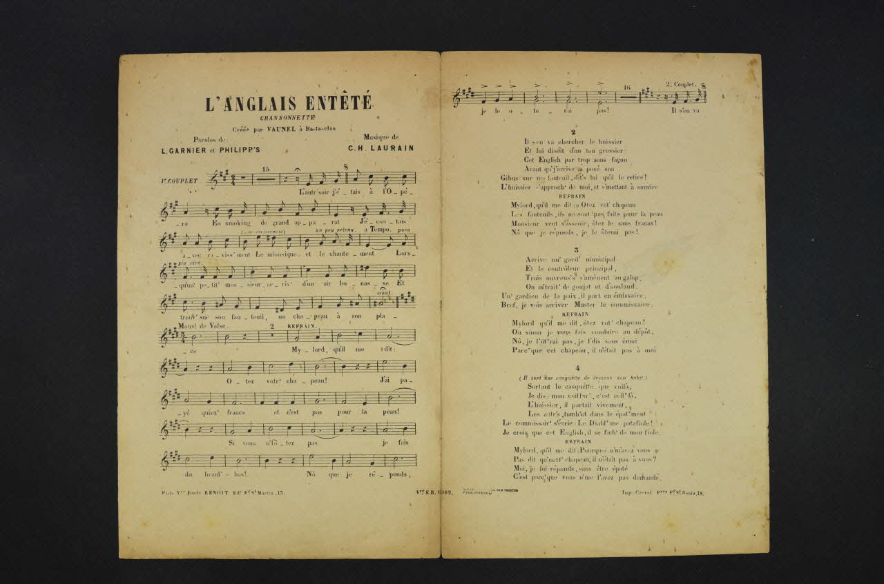 Des inscriptions renseignent le titre, les auteurs, les exécutants et l'éditeur. A l'intérieur, partition et paroles de la chanson. Au dos, liste d'autres partitions publiées par l'éditeur.Matériaux et techniques