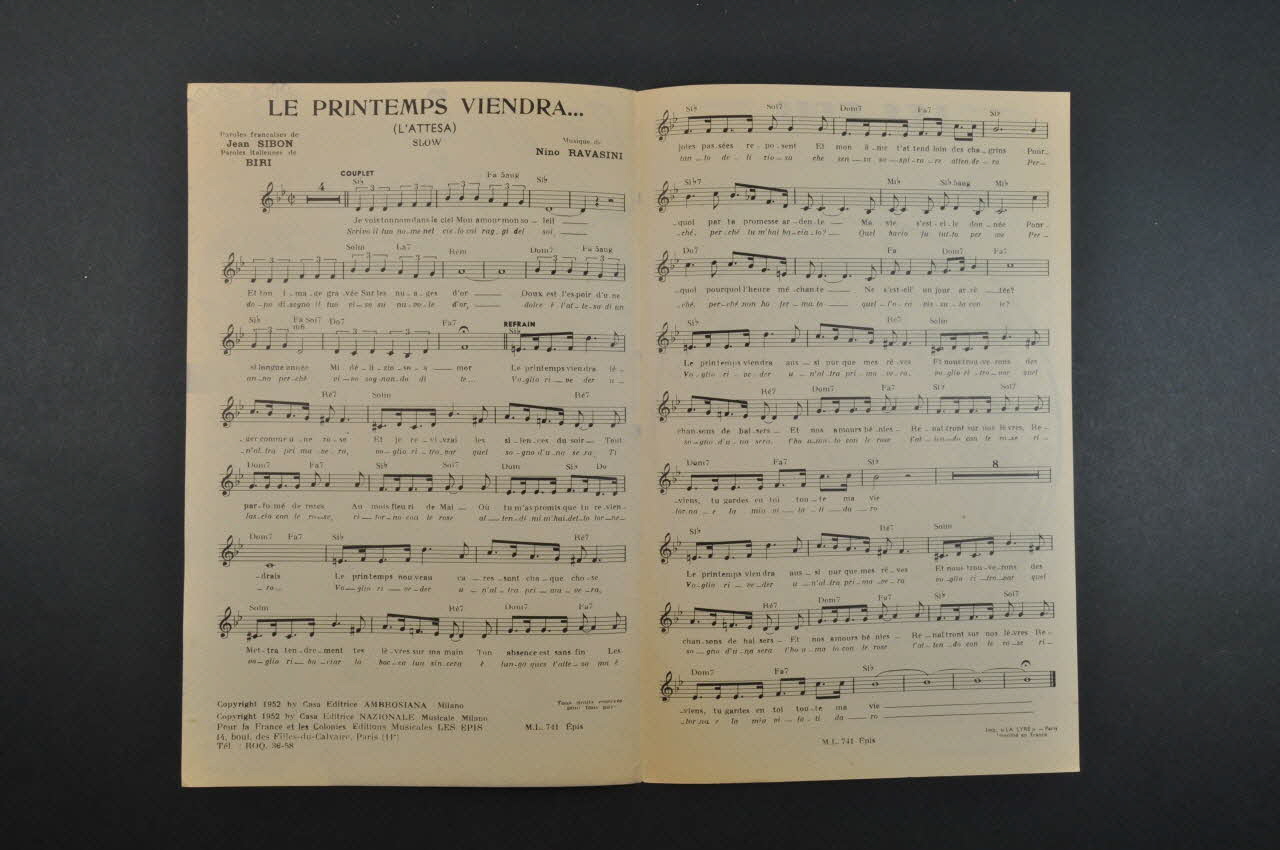 Des inscriptions renseignent le titre, les auteurs, les exécutants et l'éditeur. A l'intérieur, partition et paroles de la chanson. Au dos, liste d'autres partitions publiées par l'éditeur.Matériaux et techniques