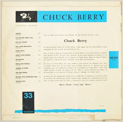 "C'est un plaisir pour moi de vous présenter l'un des pionniers du rock'n'roll : // Chuck Berry // A l'égal de Gene Vincent ou de Bill Haley, Chuck restera une des personnalités les plus marquantes de cette musique que nous aimons tant. // Pour se rendre compte de la personnalité de Chuck Berry, il vous suffit d'assister à n'importe quel spectacle de R n' R pour vous apercevoir qu'une grande majorité des chanteurs et de groupes basent leur répertoire sur les chansons de Chuck Berry. Même les "grands" Beatles ont emprunté à Chuck des succès confirmés comme Roll over Beethoven. // Les succès de Chuck Berry sont trop nombreux pour pouvoir les énumérer tous. Dans ce premier album qui sort en France vous trouverez réunies ici 12 chansons que vous connaissez tous, ceci représente le meilleur de la production de Chuck Berry : Sweet little sixteen, Johnny be good. La plupart ont été créées en version française par Johnny ou par moi-même et ont rencontré en France comme à l'étranger un énorme succès. // Je pense que vous apprécierez comme moi la totalité des 12 chansons de cet album. Outre la truculence des merveilleuses paroles anglaises (que quelques-uns comrendront j'en suis sûr), ce grand artiste mêle ses talents de guitariste à celui d'un chanteur de grande classe. // Bravo Chuck "crazy legs" Berry" (au dos de la pochette, un texte d'Eddy Mitchell présente Chuck Berry comme l'un des pionniers du rock'n'roll)Barclay // 80 225 // Standard (référence de l'album)Décor
