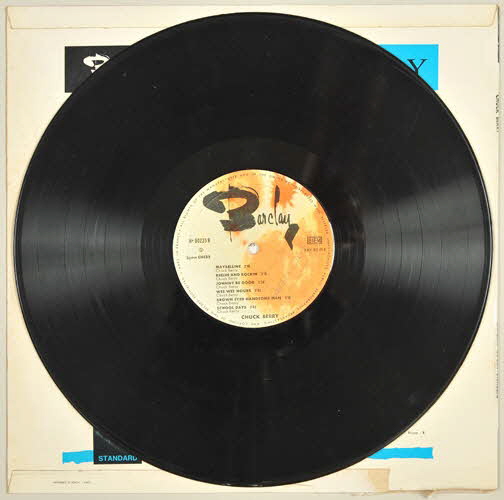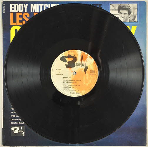 disque en vinyle de couleur noire / pochette en carton / au recto de la pochette, photographie de Chuck Berry, jouant de la guitare, de profil et accroupi, portant un costume beige - fond bleu - en haut à droite, photographie en noir et blanc du visage d'Eddy Mitchell - titre de l'album en grasses lettres capitales de différentes couleur - texte d'Eddy Mitchell au dos de la pochette / disque de couleur noire - motif dans les tons de jaune et orange et signature spécifique de la maison BarclayInscriptions
