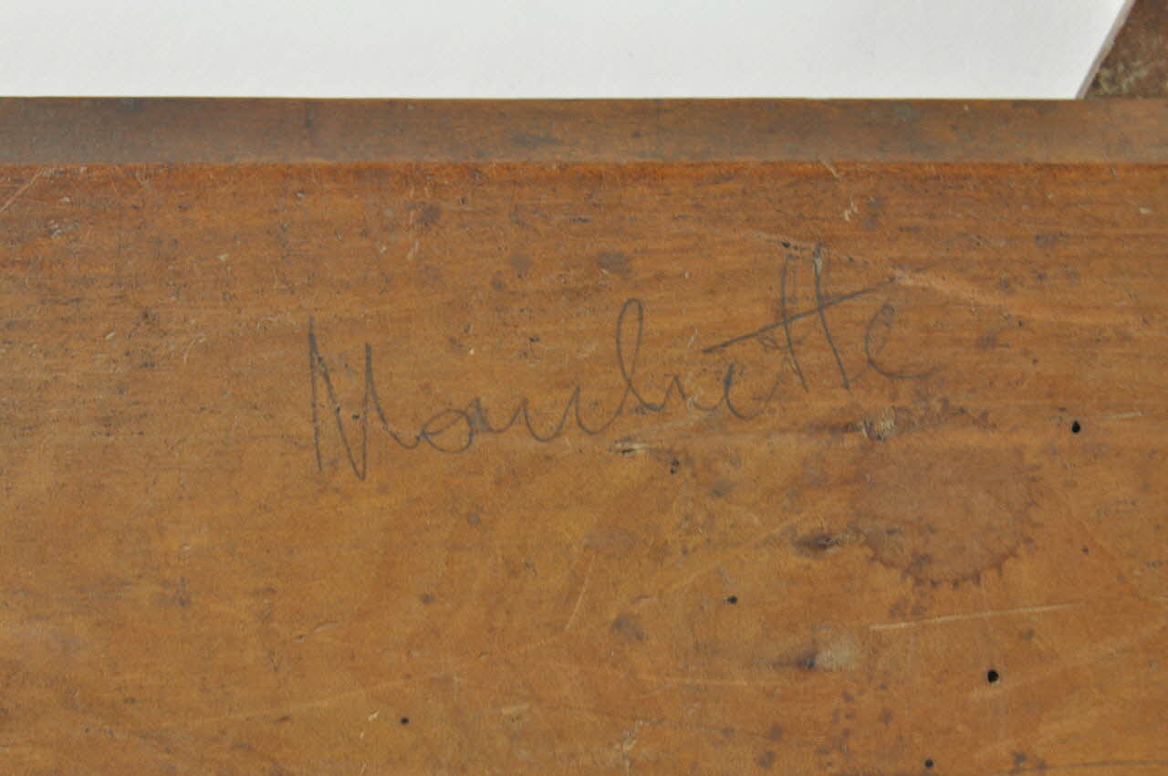 Plaque de bois rectangulaire avec une face plate et une face comportanr deux larges moulures en bordure sur les longs côtés.