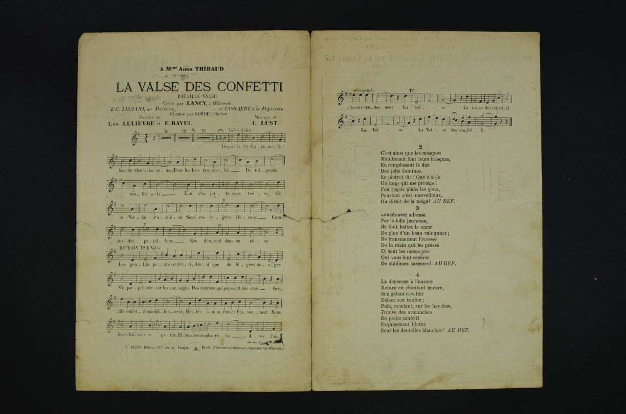 Des inscriptions renseignent le titre, les auteurs, les exécutants et l'éditeur. A l'intérieur, partition et paroles de la chanson. Au dos, liste d'autres partitions publiées par l'éditeur.Matériaux et techniques