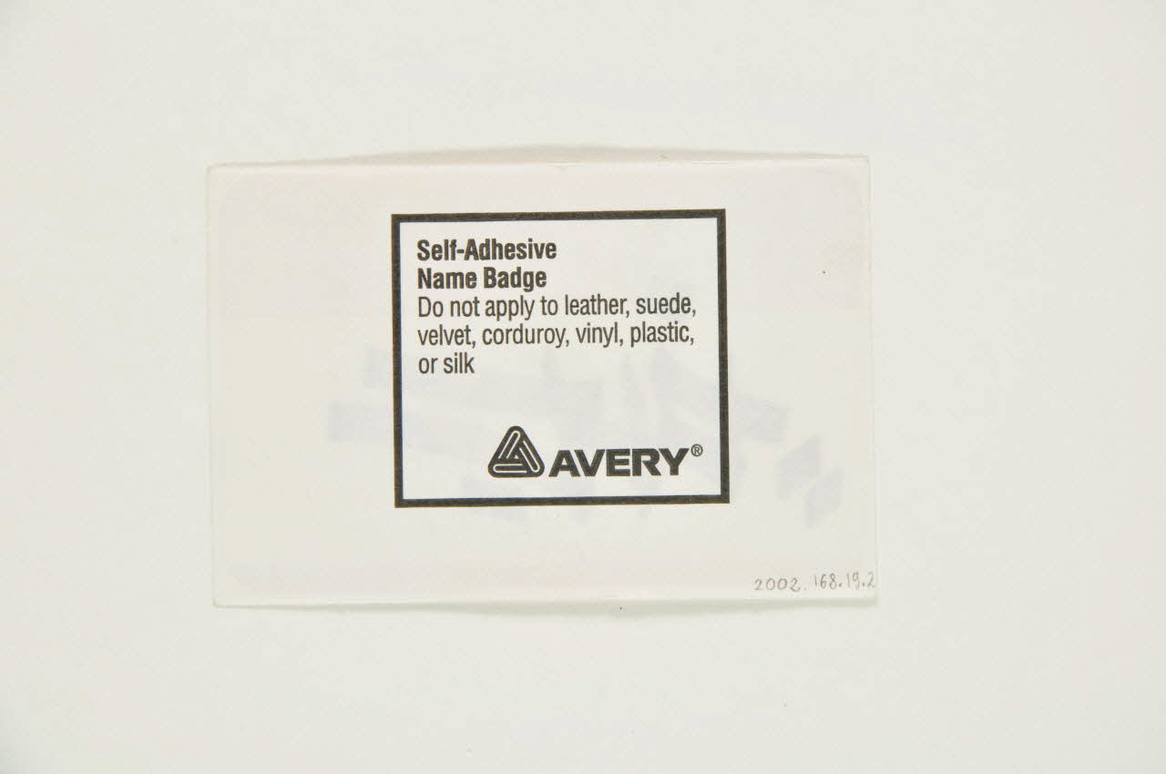 Self-Adhesif / Name Badge / Do not apply to leather, suede, / velvet, vinyl, plastic, / or silk / [logo] AVERY (Texte sur les conditions d'utilisation en anglais à l'intérieur d'un encart rectangulaire noir.), au dosMatériaux et techniques